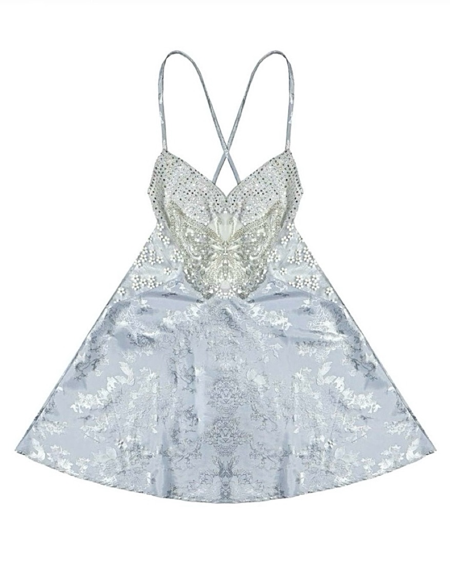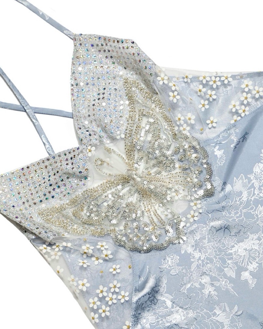 Featuring delicate spaghetti straps and a sequin-embellished butterfly bodice, this dress flows into a flattering A-line silhouette. Perfect for special occasions, it ensures you shine effortlessly. Not being produced anymore (from Revolve).