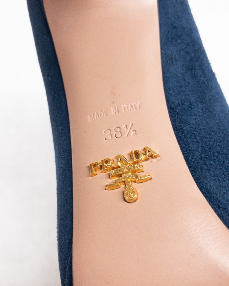 * Suede upper * Leather lining * Rubber reinforced leather sole * 4" Heel on a 0.75" platform * Slip on * Made in Italy. Prada Size 38.5 = US Size 8.5