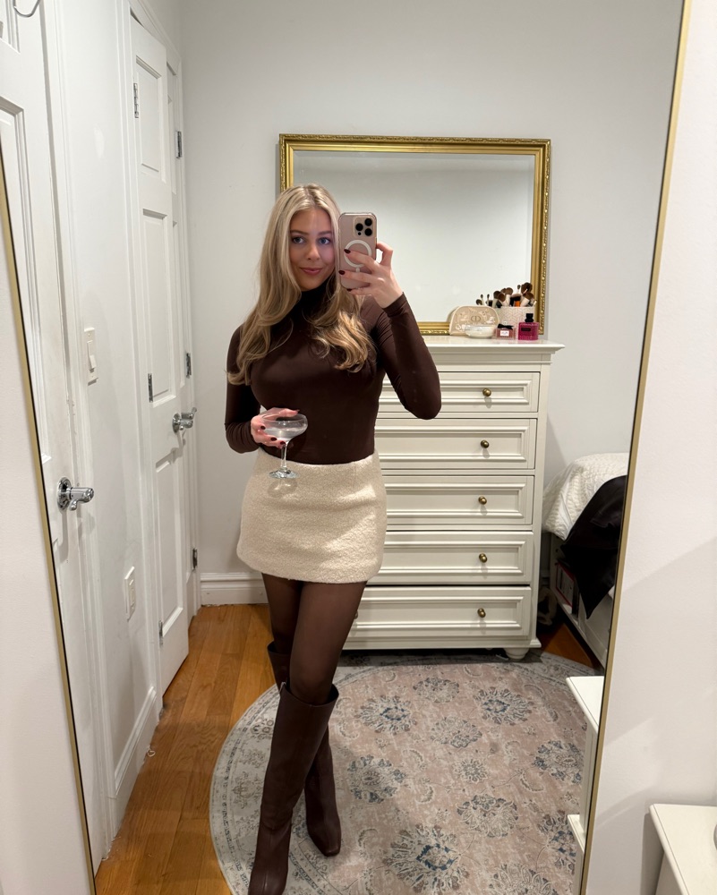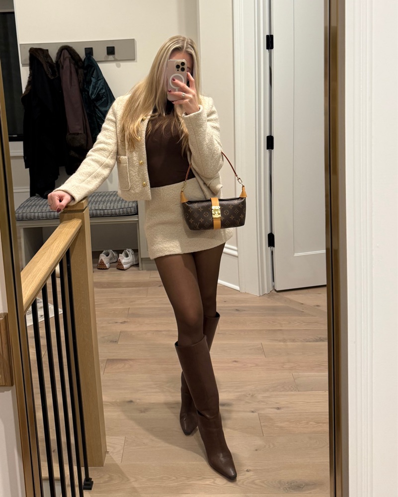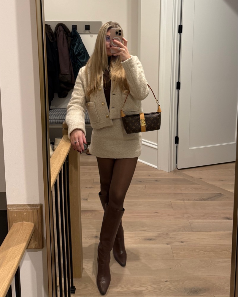 The cutest set from Oak + Fort. Sweater material, super cozy, cream color. Skirt is size 0 but fits like XS-small and the jacket is size small