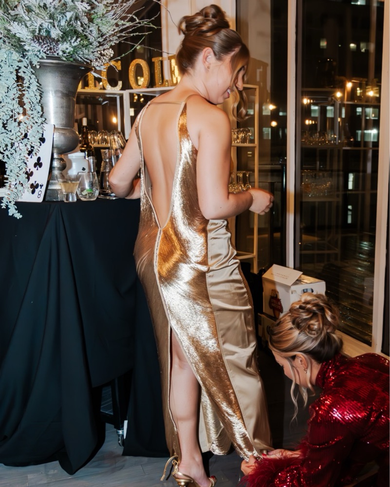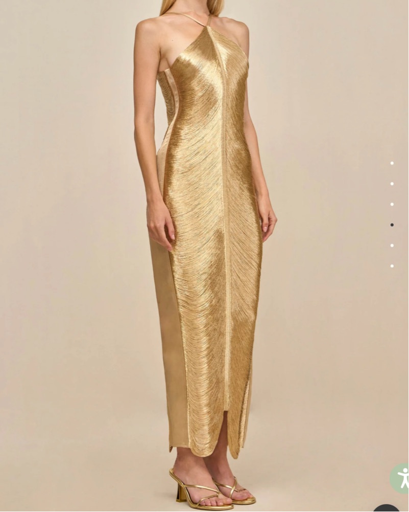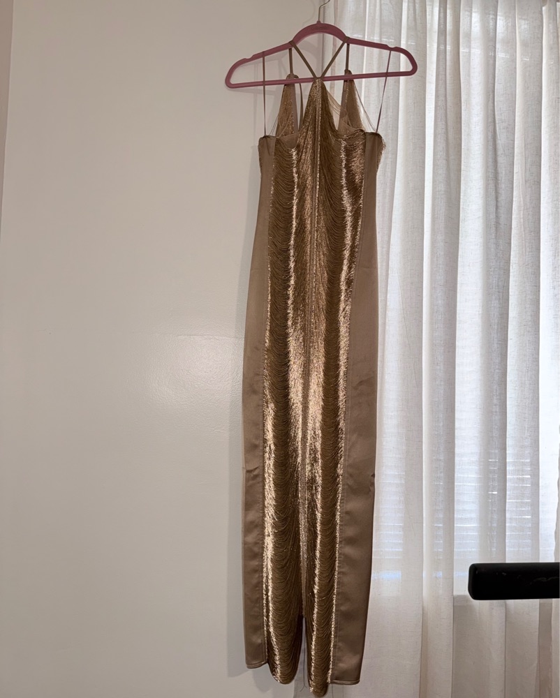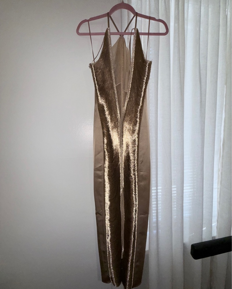 This captivating gold metallic gown is perfect for a glamorous evening event. The structural, draped design and shimmering fabric create an elegant and head-turning look. Only worn once!