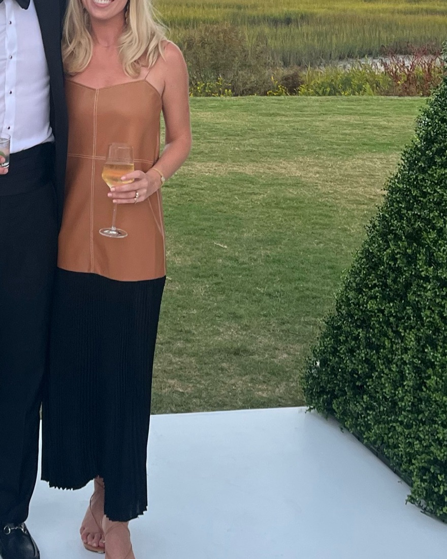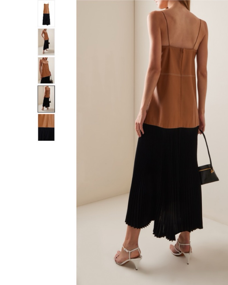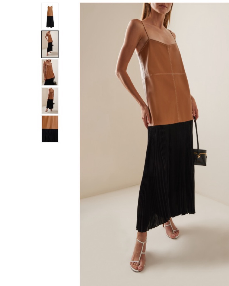 Alexis Piatta Vegan Leather-Georgette Midi Dress Resort 2025 drop-waist dress, smooth vegan leather and bouncy, plissé georgette. Formal, black tie, cocktail, fall, winter color: tan & Black