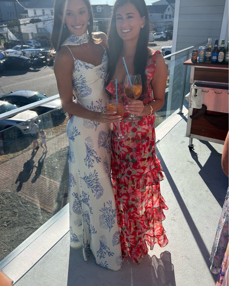 This stunning maxi dress features a vibrant floral print in shades of red, pink, and orange. Perfect for warm-weather events or beach vacations.