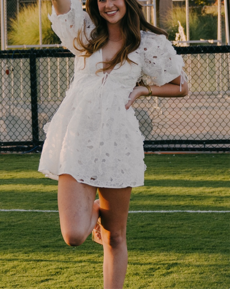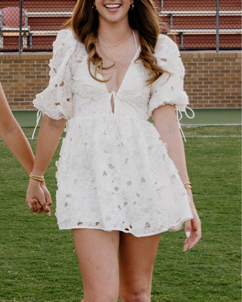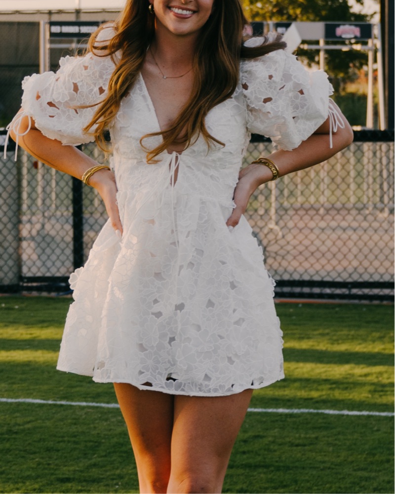 For love and lemons white lace dress with puffy sleeves. Perfect for a bride or grad
