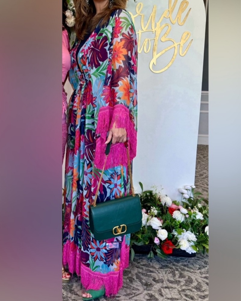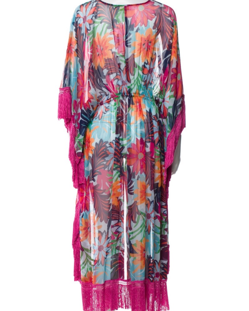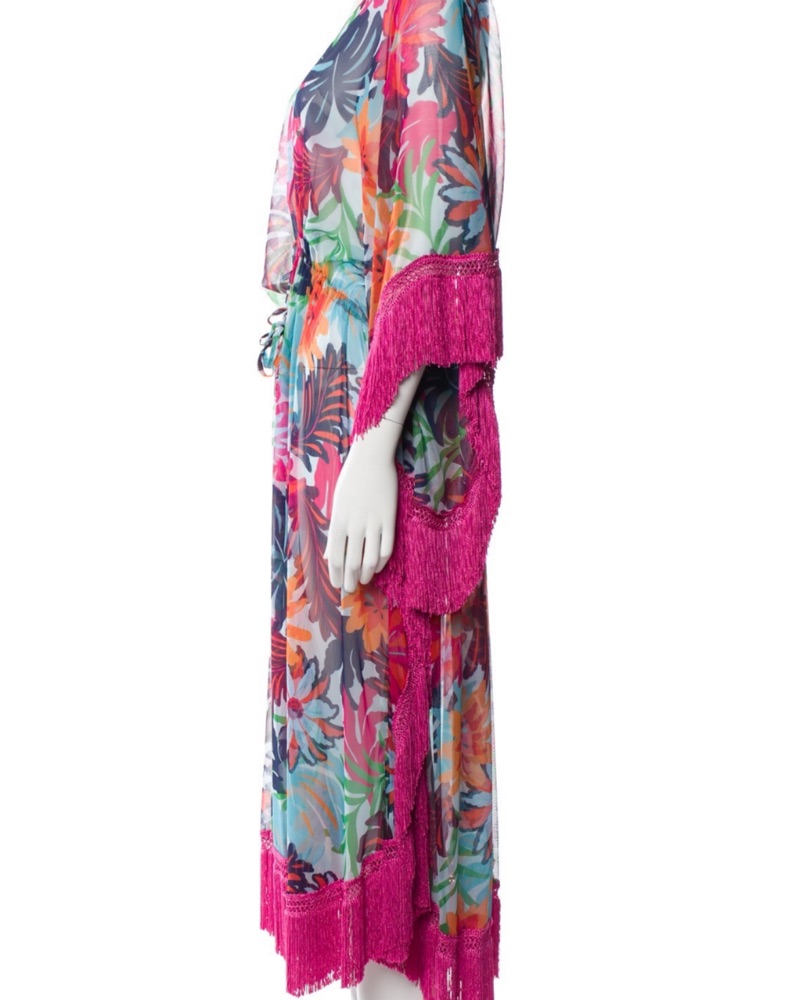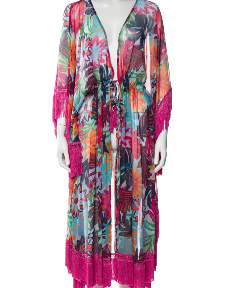 Gorgeous beach cover up kaftan robe with pink fringe, floral print, and beaded tassels by Ramy Brook in size Small. Can fit up to size medium sizes 0-8. In excellent condition. Worn only once