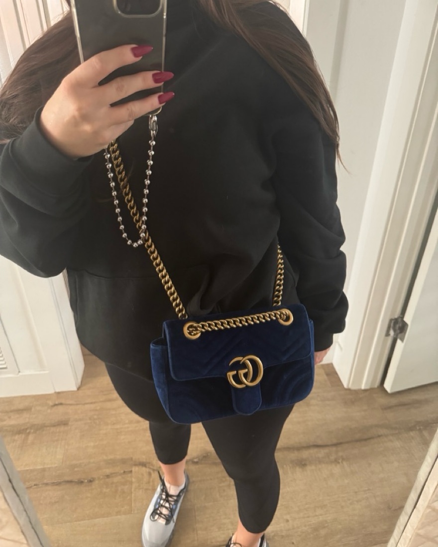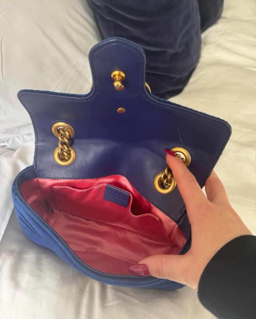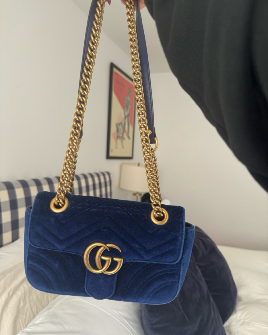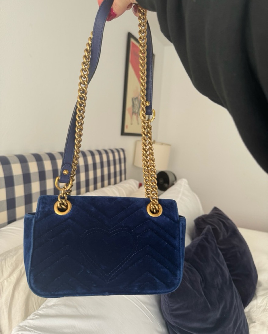 Can be worn as a crossbody or shoulder bag, very clean, blue velvet