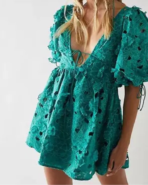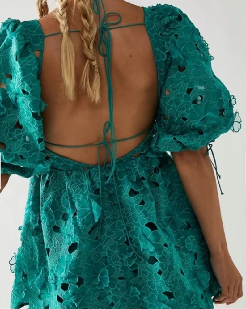Mini dress with floral detailing. Open tie back.
