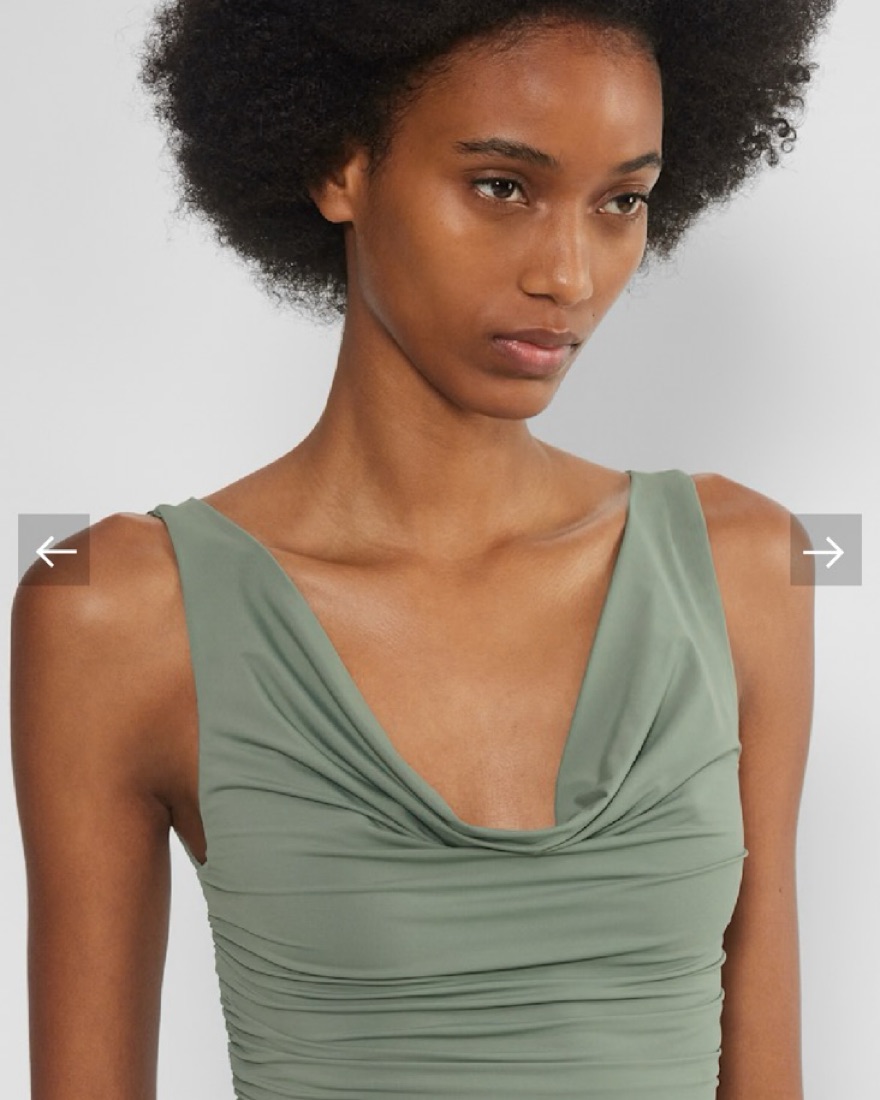 This is a sleeveless top with a cropped cut, cowl neckline and ruching at the sides in sage green. It's cut from slinky, second-skin jersey with a gentle shine and slick, body-hugging feel. Never worn, new with tags.