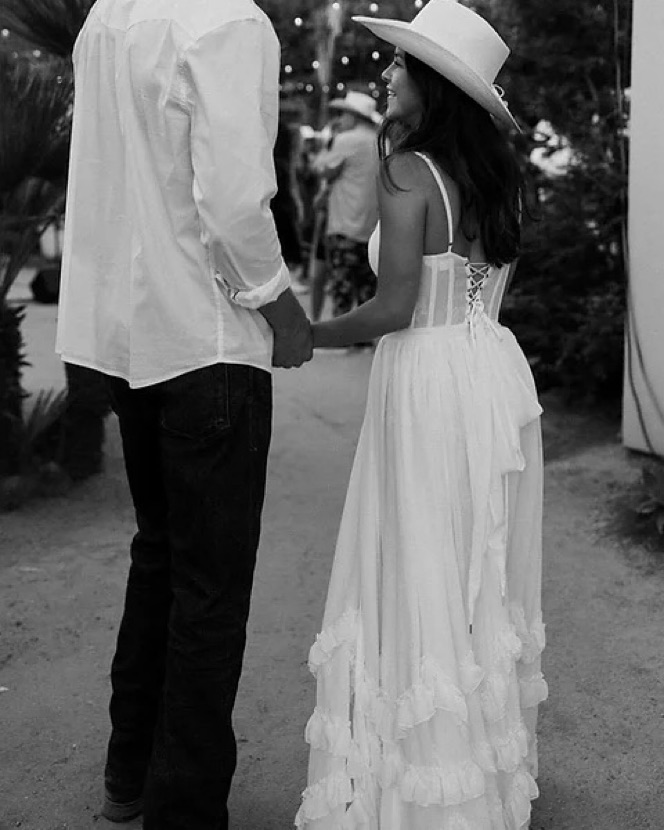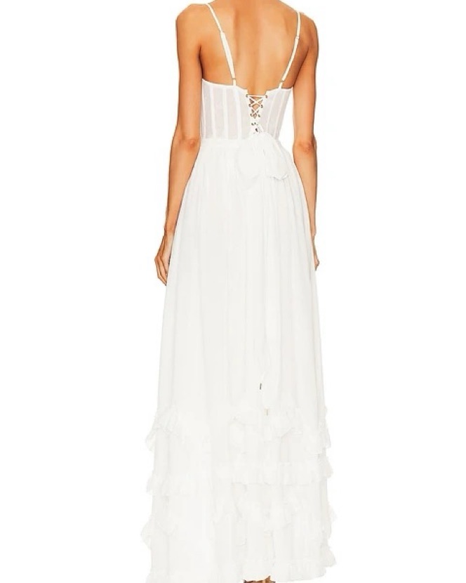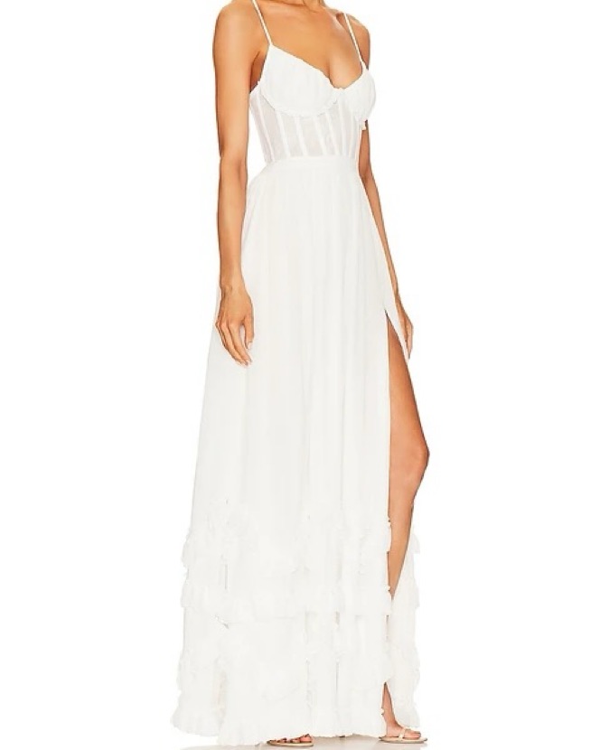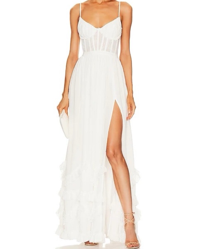 Fits sizes 0-4. Meet Carmen! She's a stunning full-length corset gown featuring a high side front slit and adorned with delicate ruffle details at the hem. She's made from our solid White chiffon over soft, subtle layers of lace and accented with a beautiful bow-tie detail at the back.