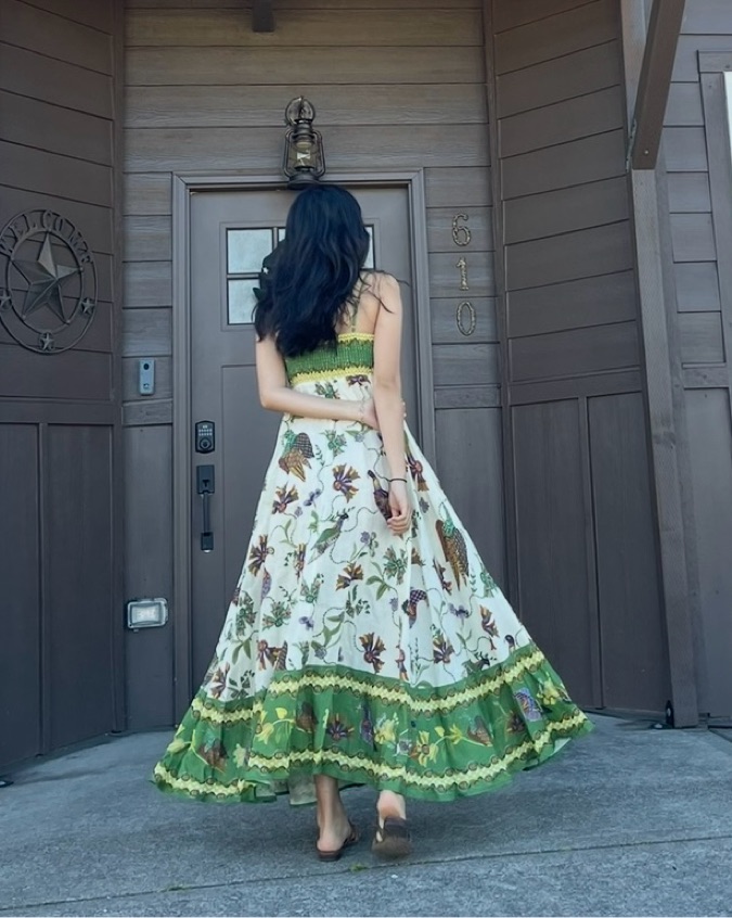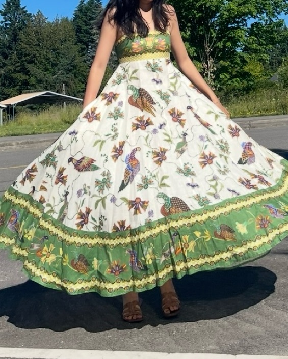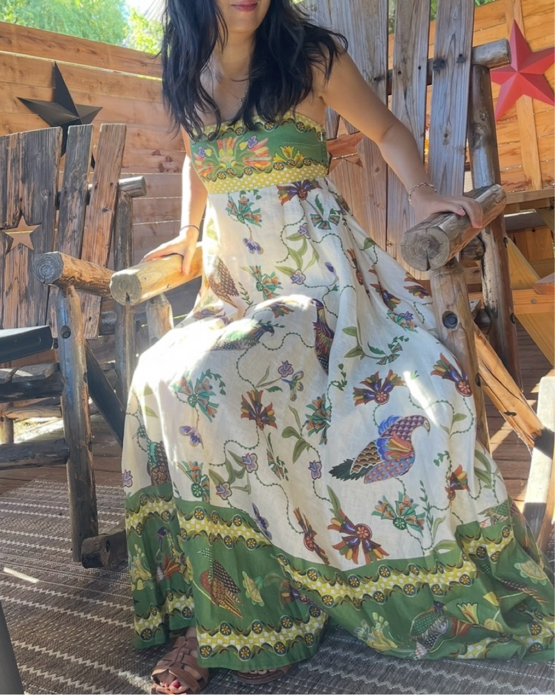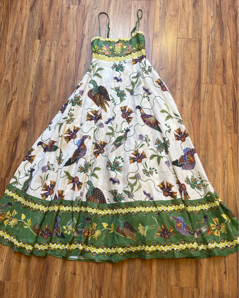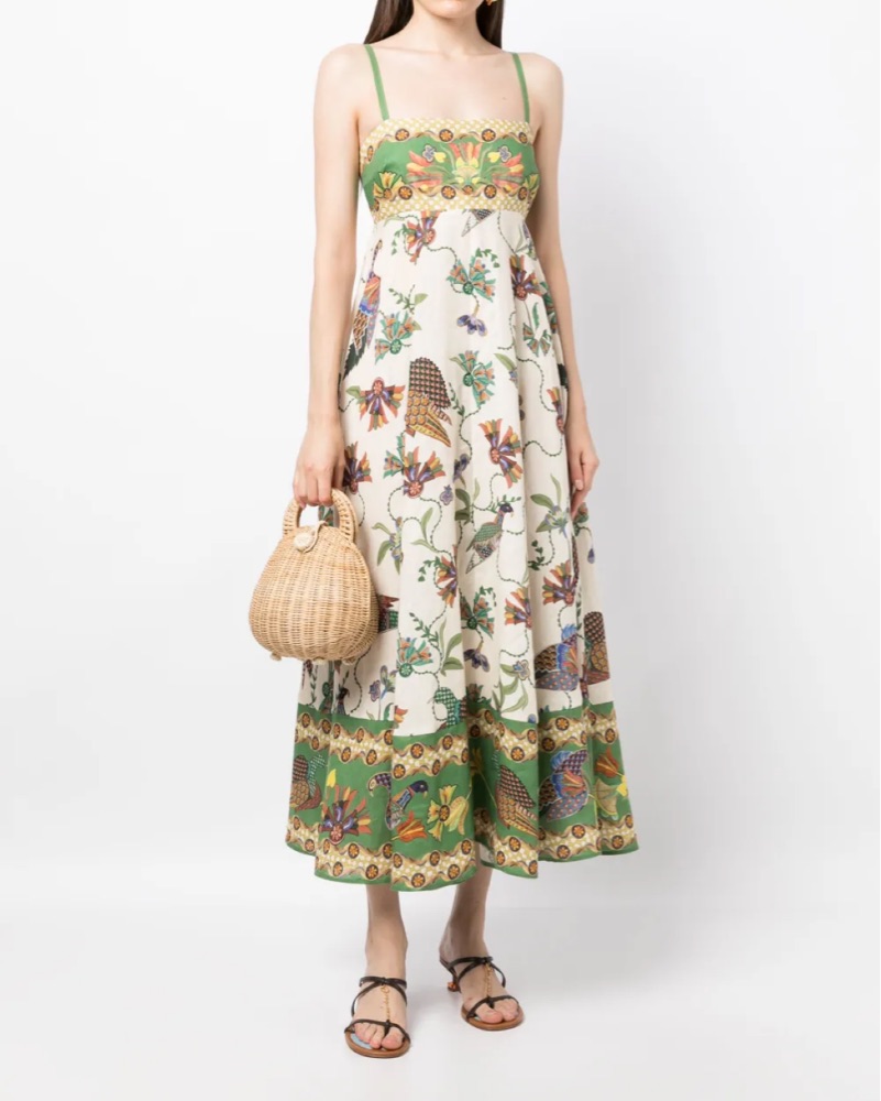 US 2 AU6. Birdie sleeveless linen midi dress from ALEMAIS featuring bird botanical print, empire line, shirred panel, square neck, square open back, adjustable spaghetti straps. Approx measurements: waist 12-13” across, length 50”