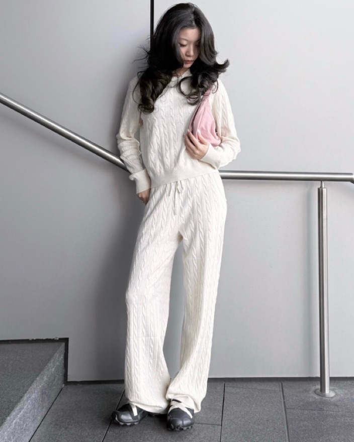 This soft and comfortable knit set is perfect for lounging around the house or running errands. The relaxed fit and cable knit detailing create a chic, casual look. (off white color)