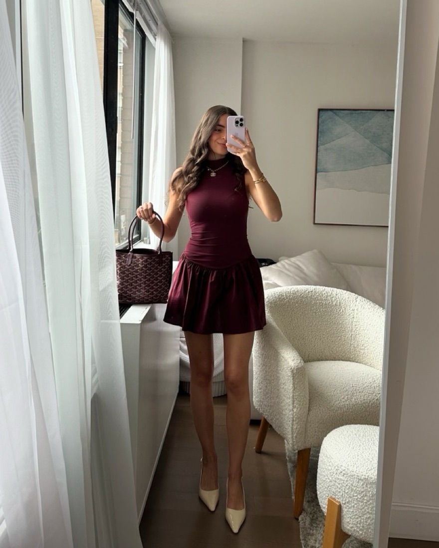 Renting my adorable weworewhat mock neck maroon bubble drop waist dress cutest dress for weekend plans or fall activities in nyc