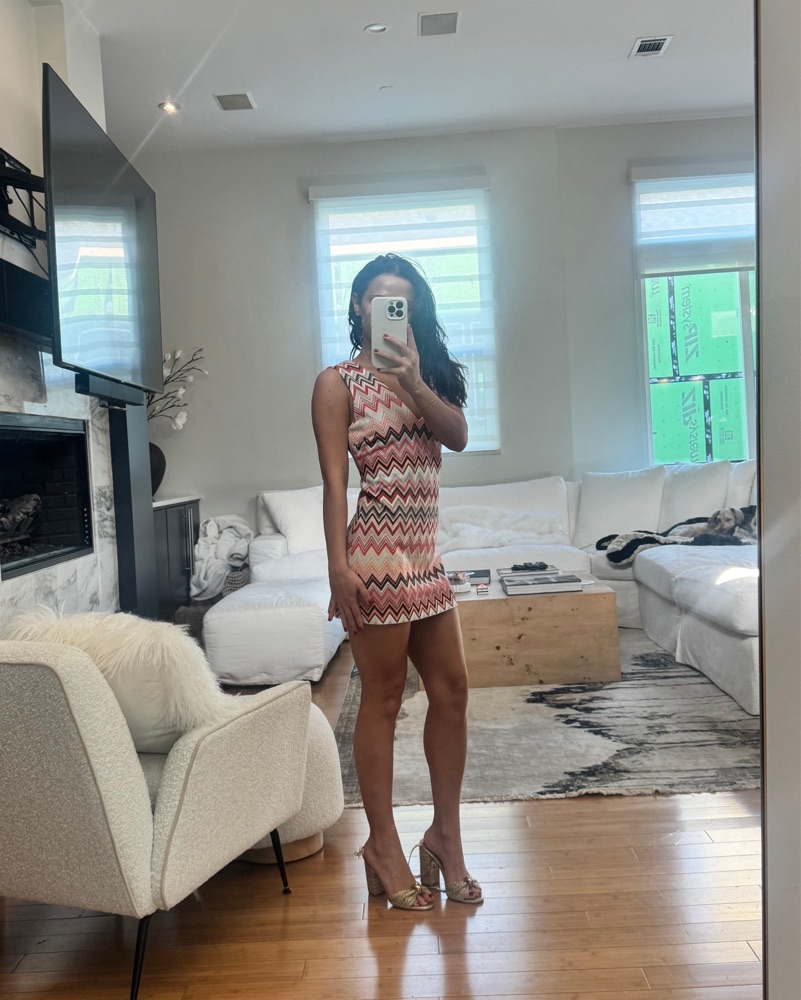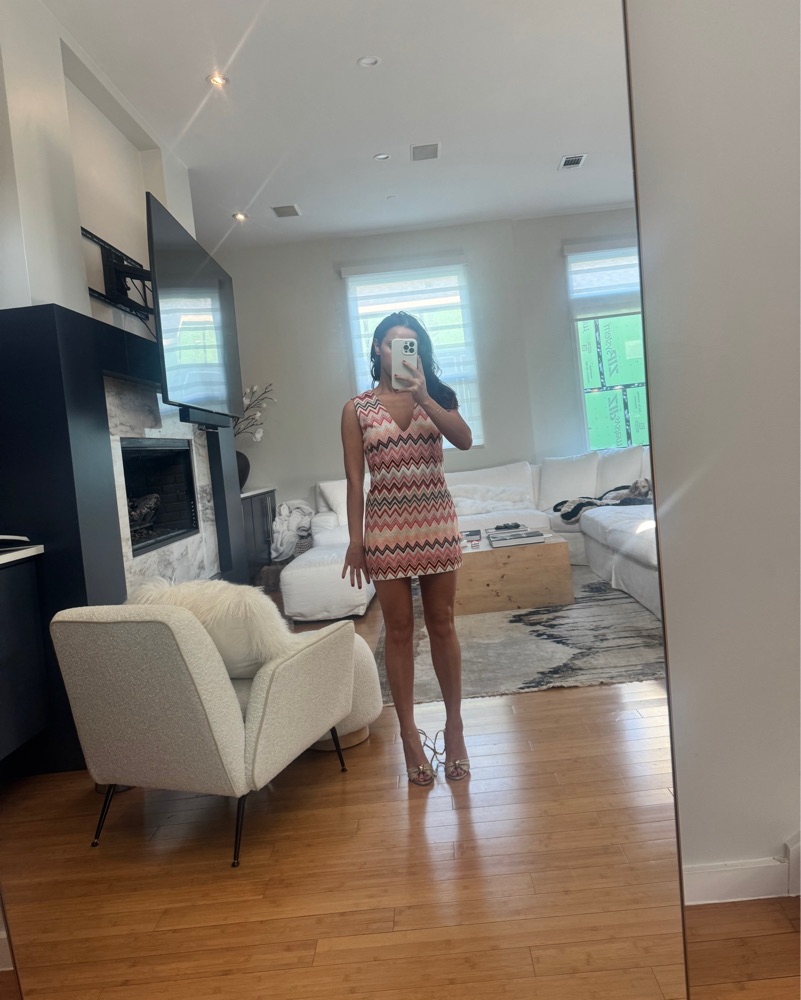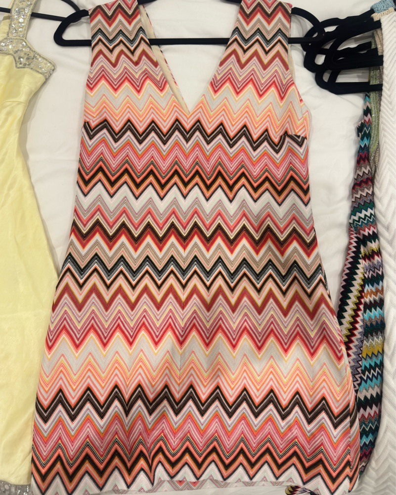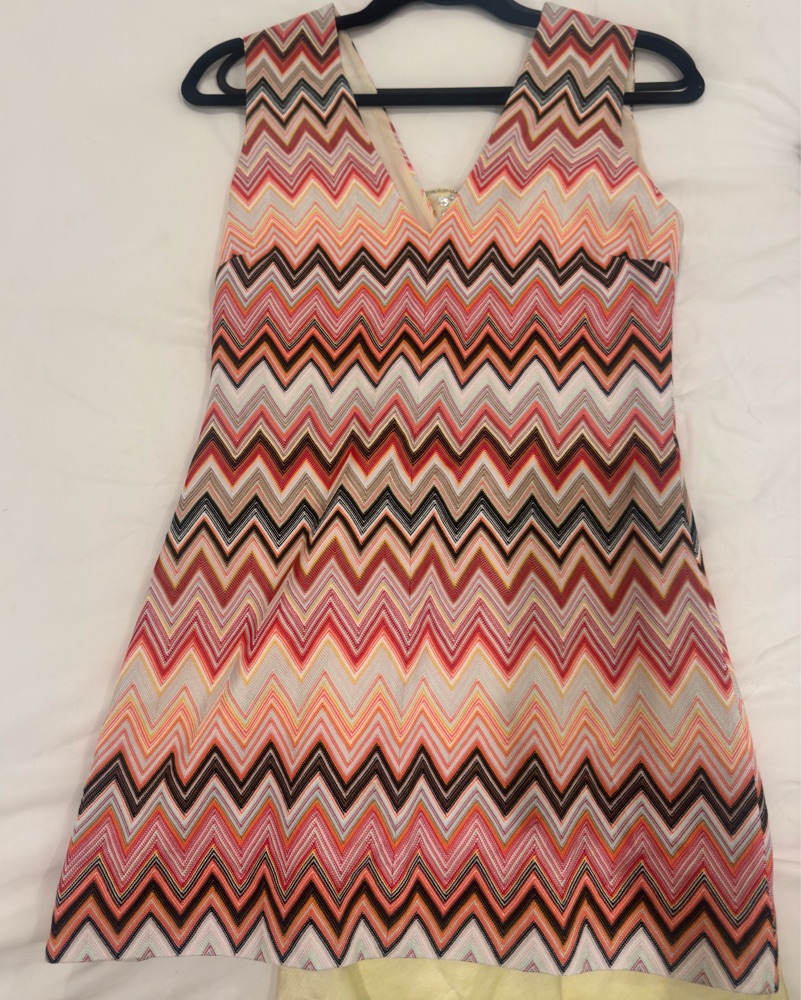 Tailored to fit me 5’1 and 105 pounds. Fits like an xs. This Missoni mini dress is crochet-knitted from a comfortable cotton blend with the signature, colorful zigzag motif. It features a figure-skimming fit that flares out at the hem, and a deep V-neckline that is mirrored at the back.