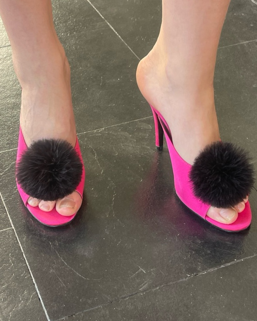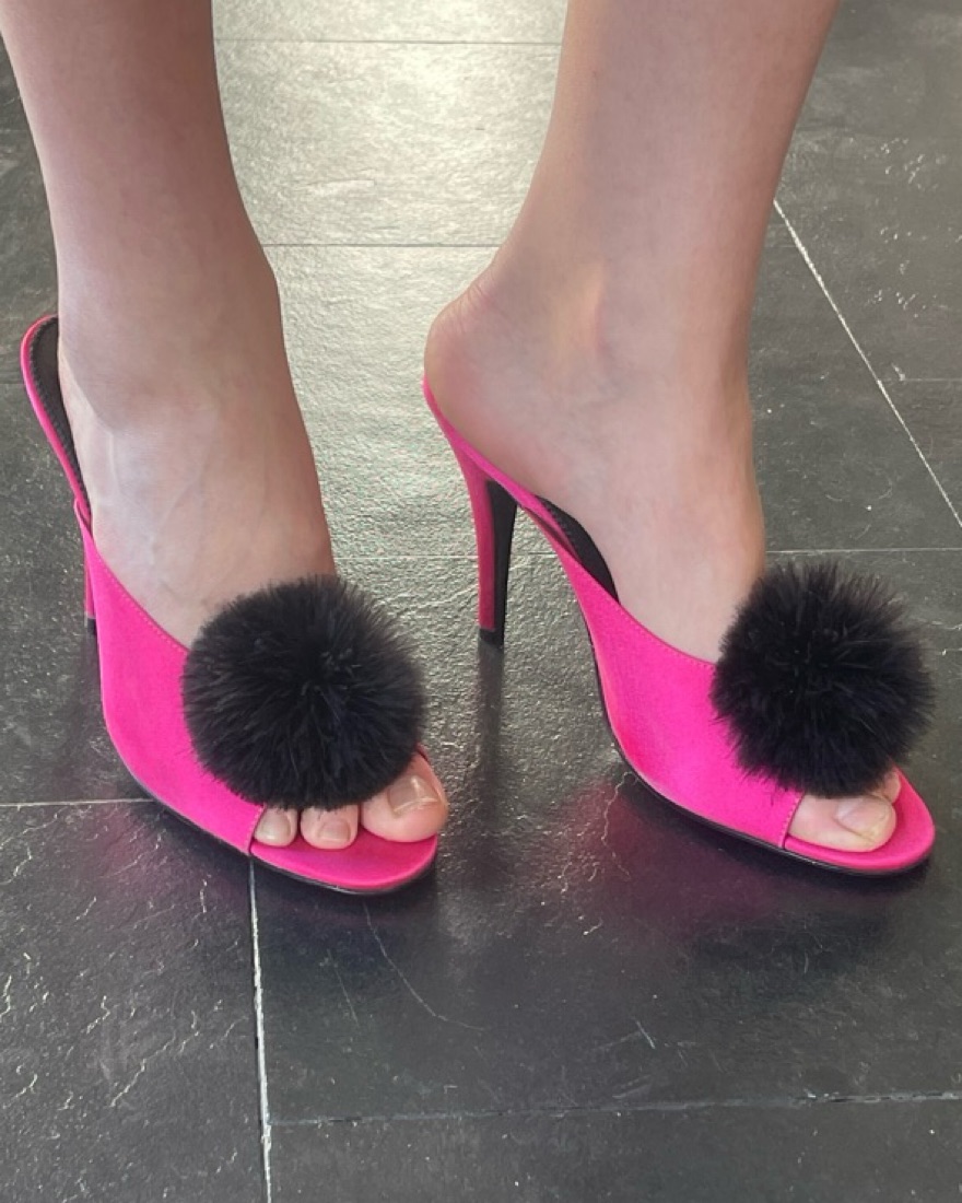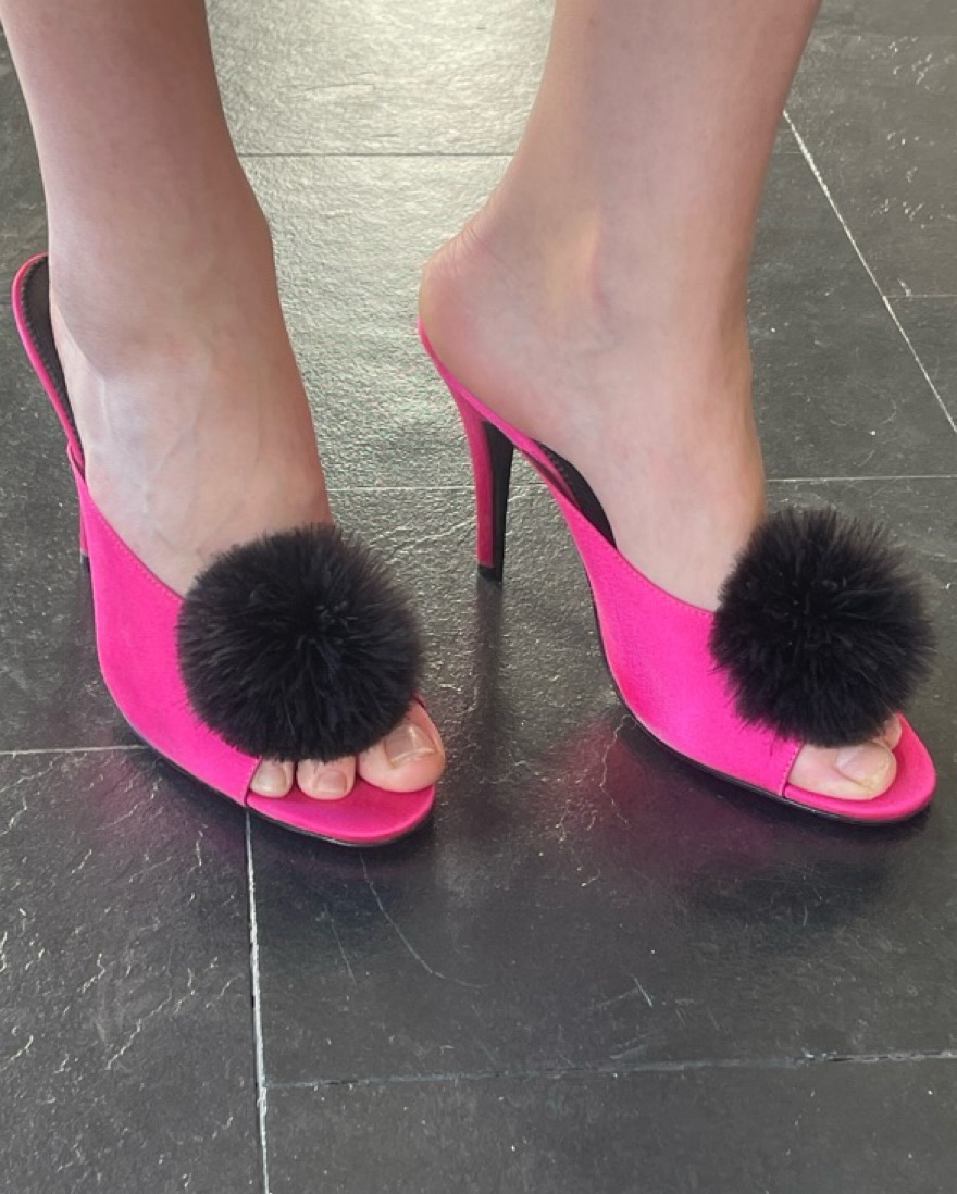 Peep toe with pom pom. Size 40, fits like a US9. Never worn, some small scuffs from moving