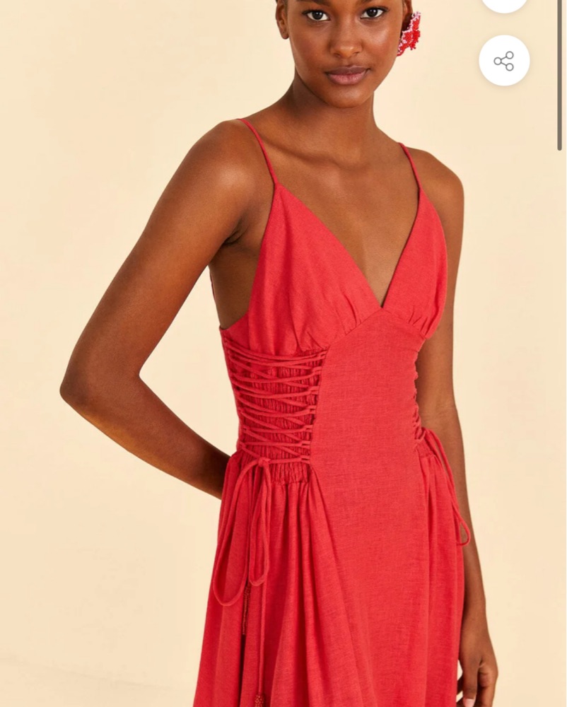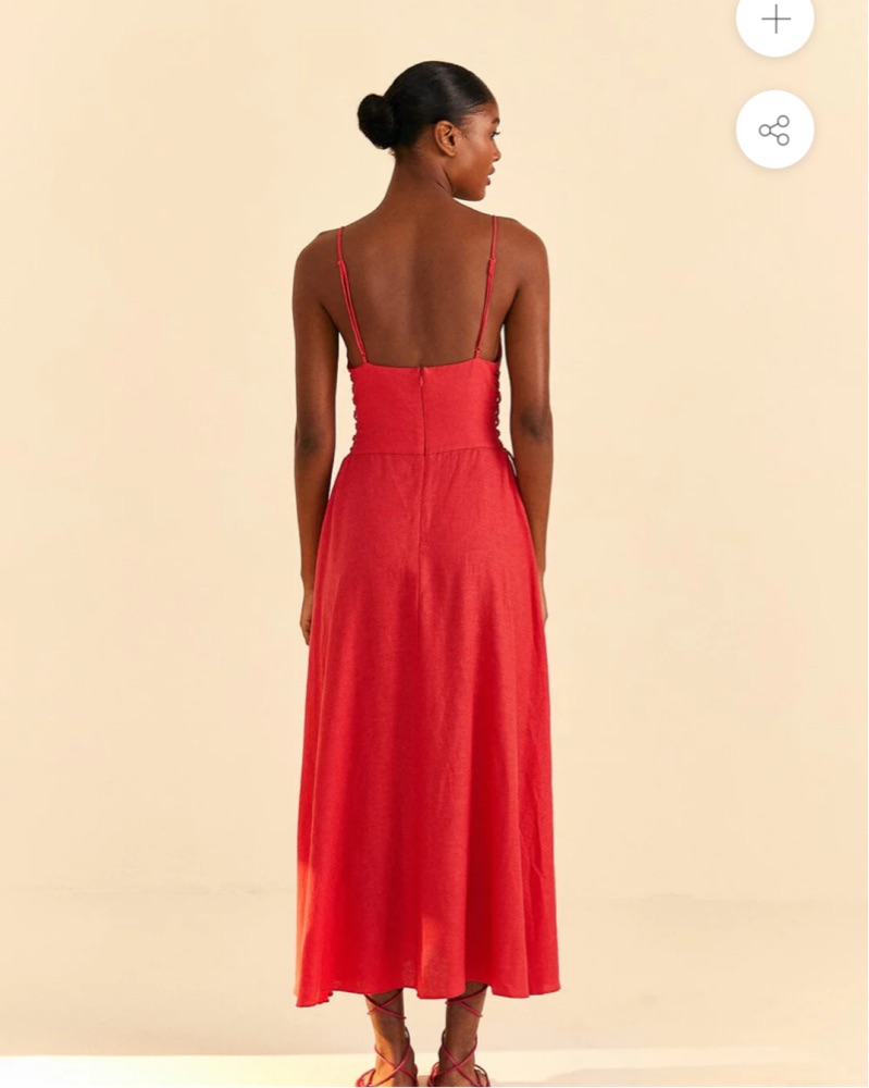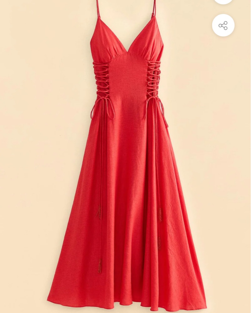 Plunging neckline. Breathable cotton. Back zipper closure and the ties on the side are actually functional you can cinch the dress or let it out for a perfect fit.