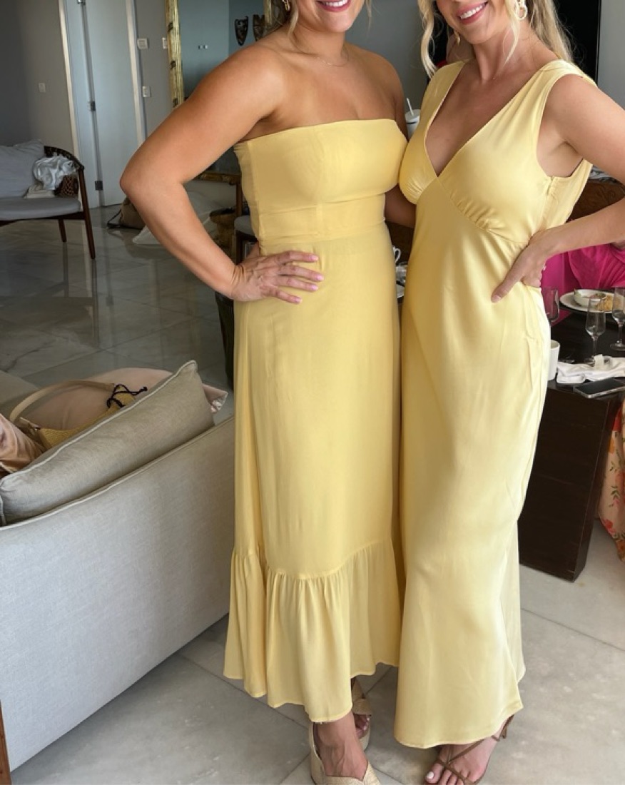 This beautiful strapless yellow maxi dress is perfect for a special occasion. The flowing silhouette and vibrant color create a chic and elegant look.