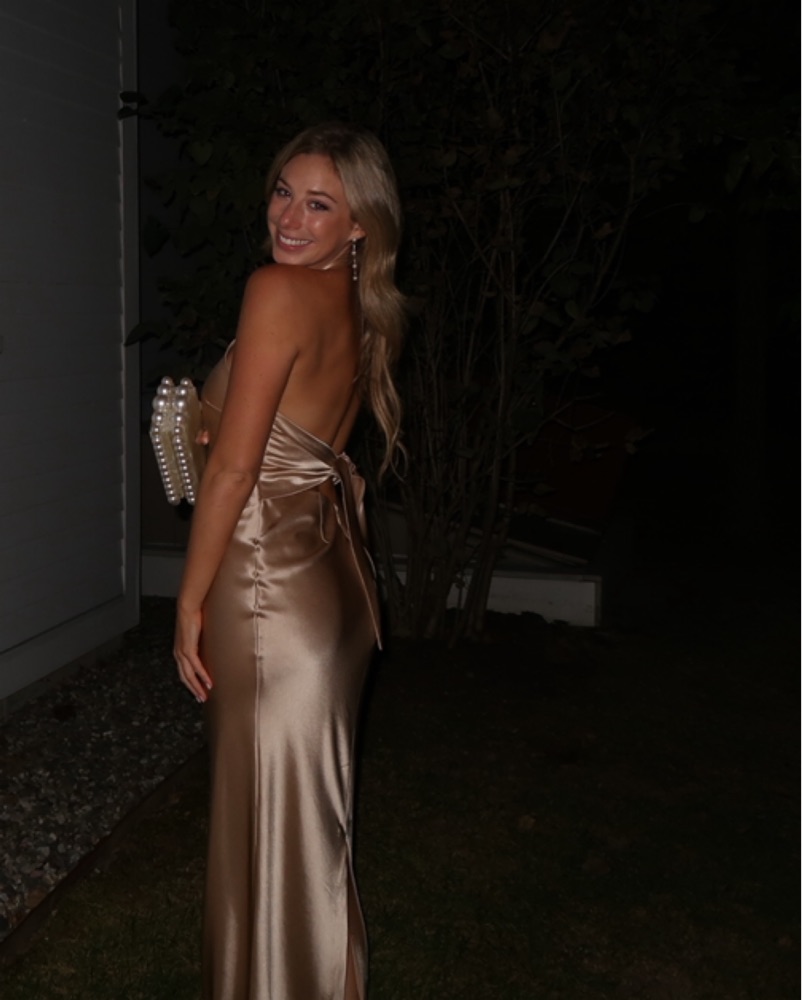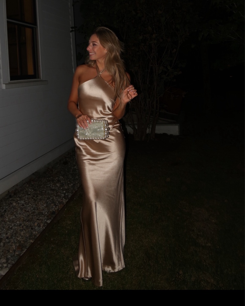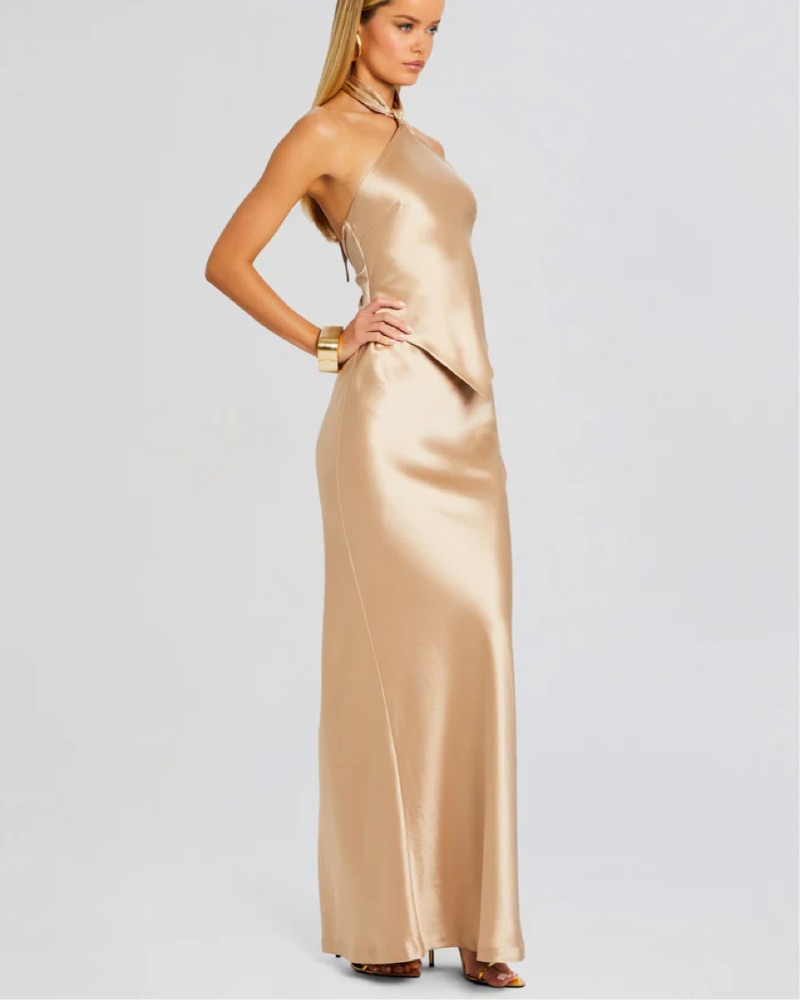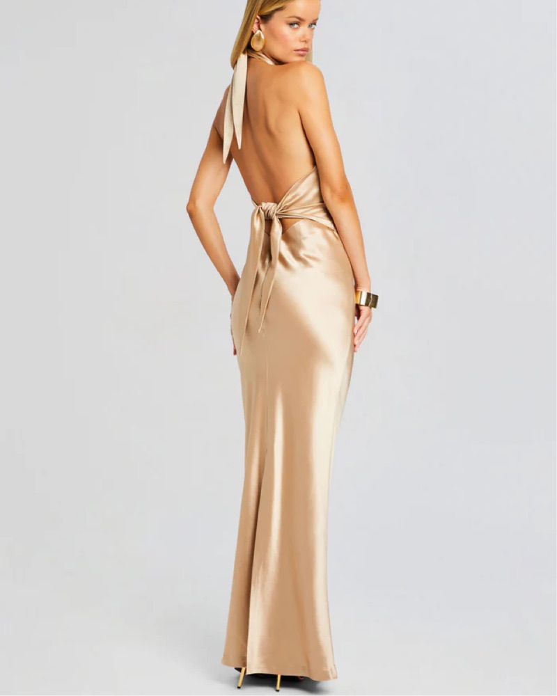 This stunning satin gown is perfect for a formal event or special occasion. The halter neckline and figure-hugging silhouette create an elegant and sophisticated look.