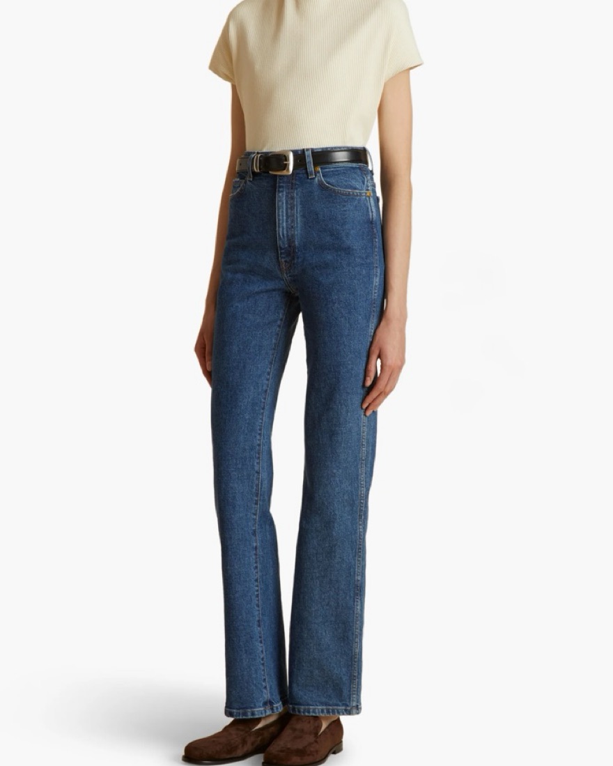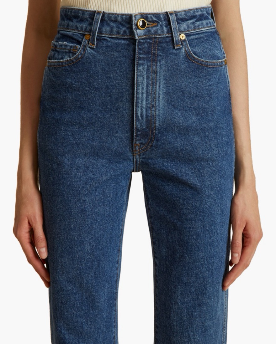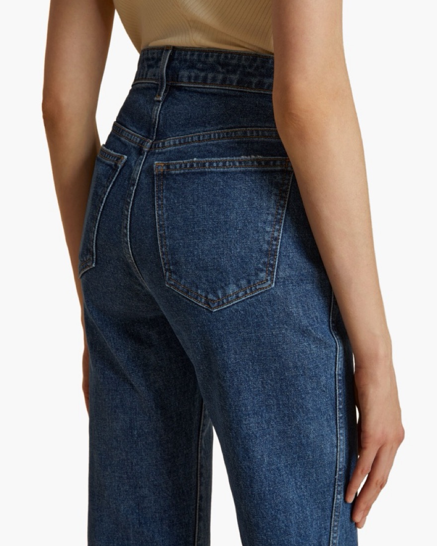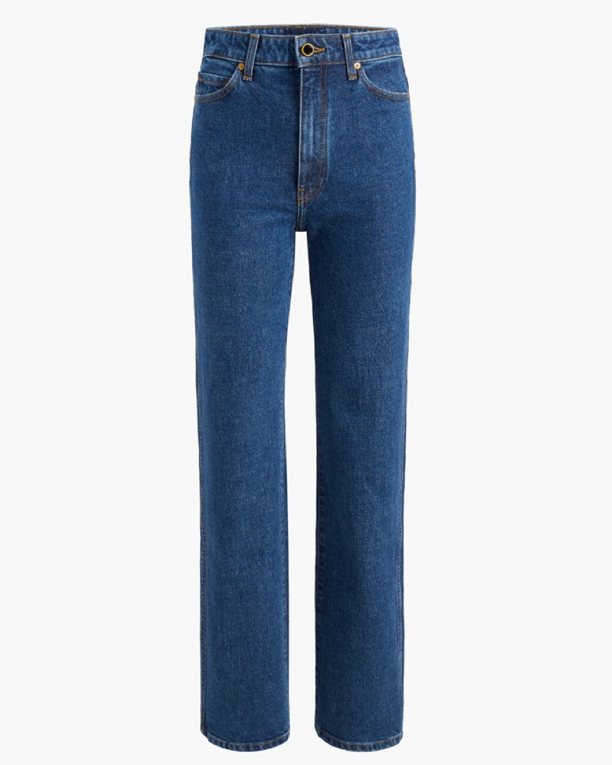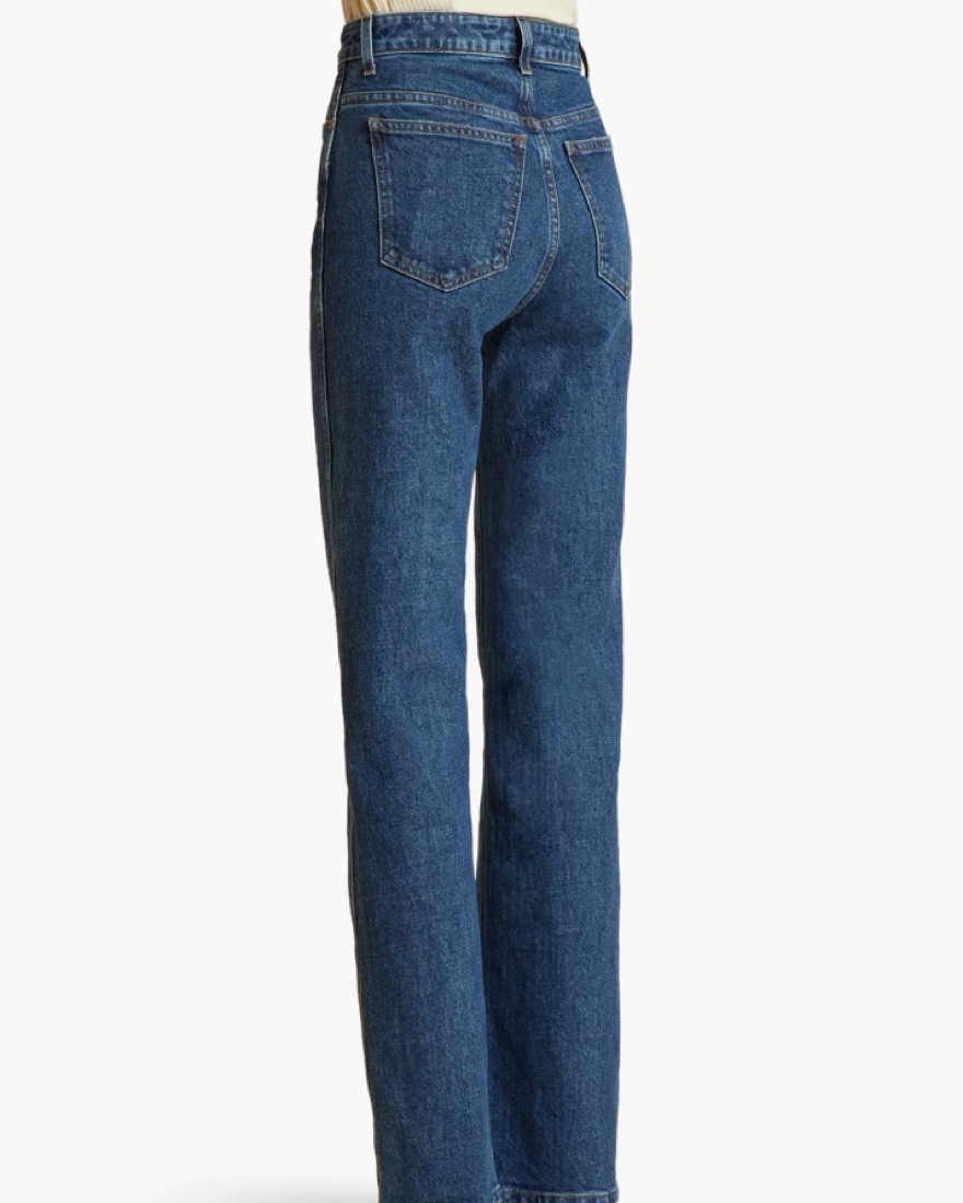 Designed to visually elongate the legs, these high-rise jeans flatter with a stovepipe silhouette and the structure of pure cotton denim. Color is Montgomery.