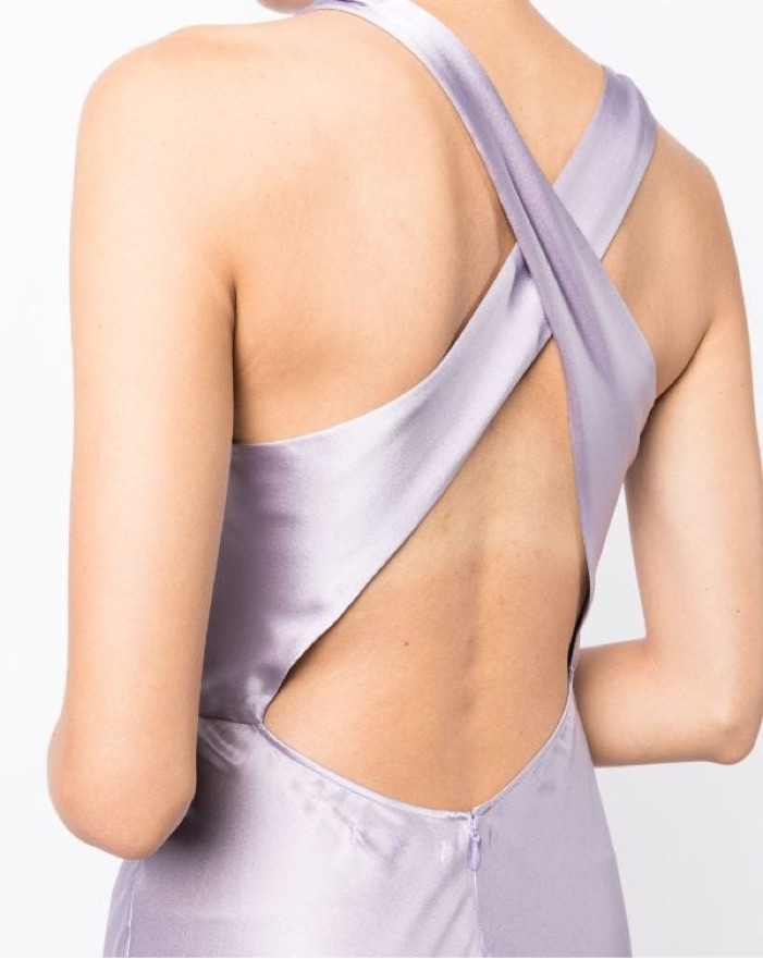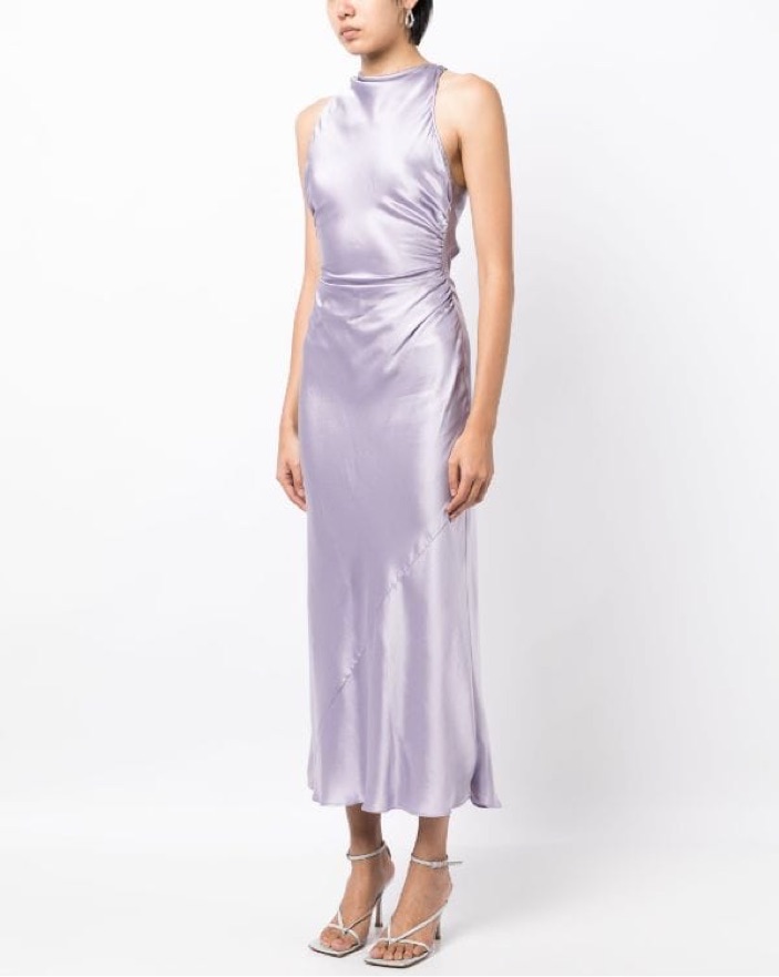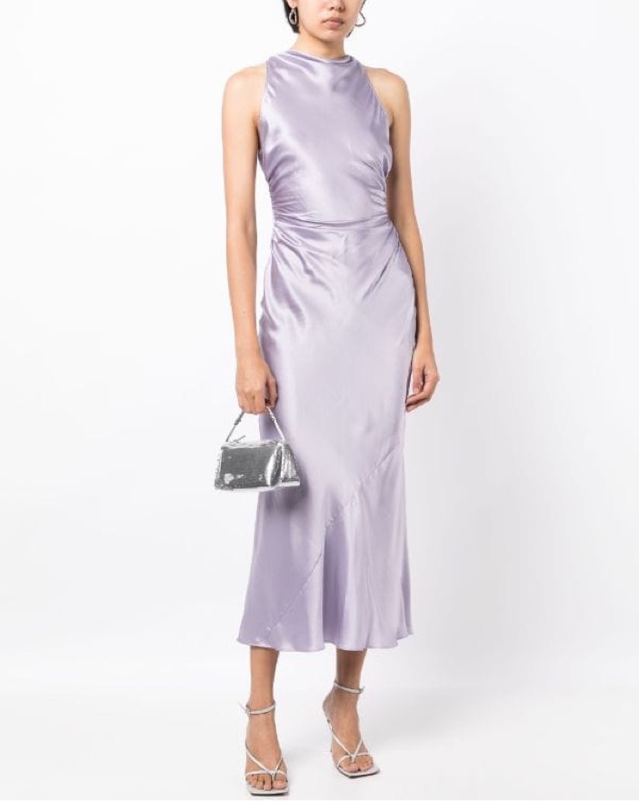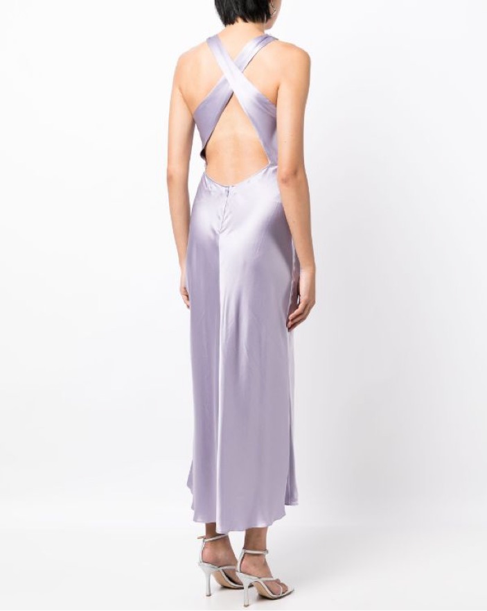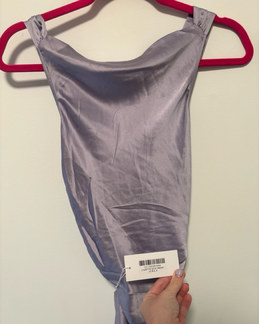 NWT FULL LENGTH Lilac Silk Dress from reformation eith beautiful open back criss-cross style and waist-snatching side ruching. “Cassette Silk Dress” in color “Aura” size 4