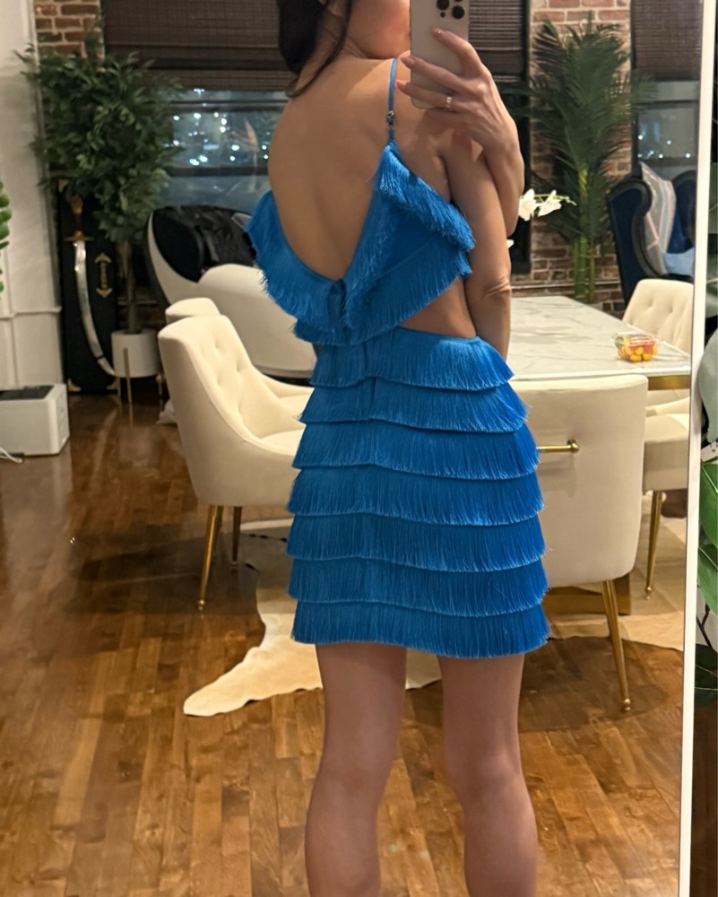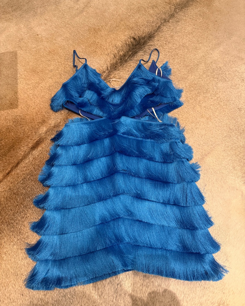 Brand new and very rare Patbo all over fringe dress in cobalt blue with cut out accents. Size tag is size 4 but Patbo runs one size smaller so true fit is Size 2. Bust 32 inches, waist is open to 25-27 inches, hips 34-35 inches.