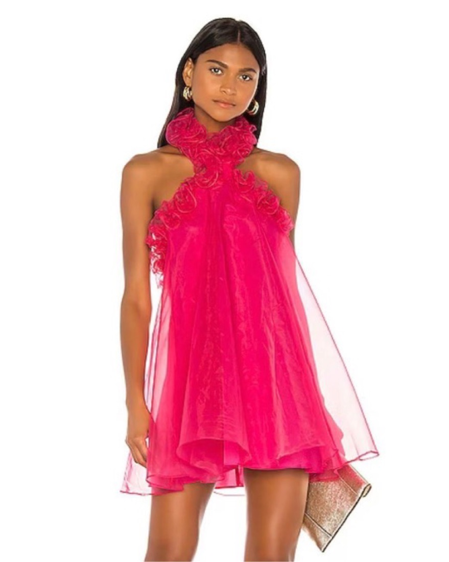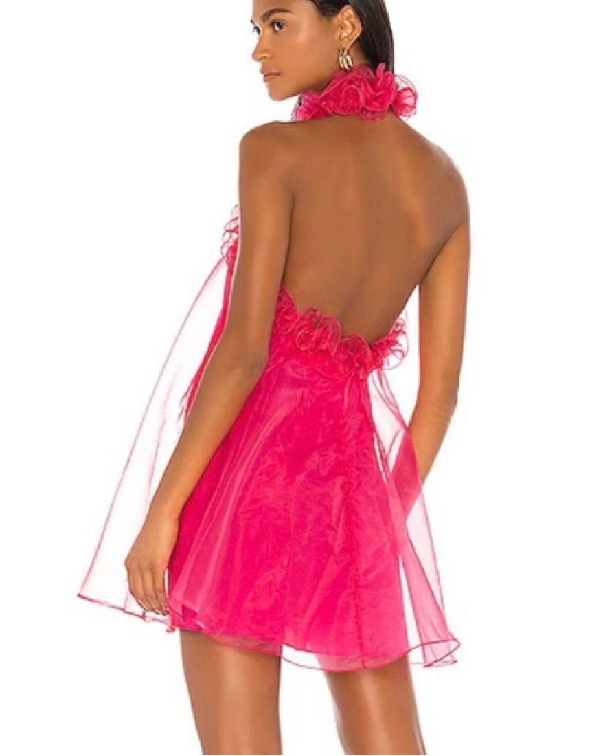 Lovers And friends calti Pink Halter Mini dress. 100% nylon Lining: 100% poly. Hand wash cold. Hidden back zipper closure. Halter neck with button closure. Organza overlay.