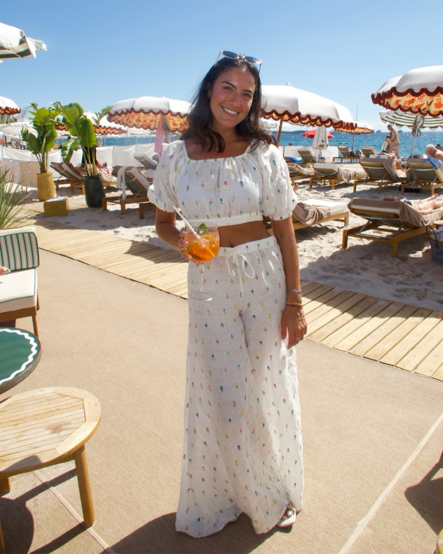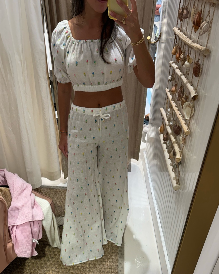 Two piece white linen set with floral block print. Top is size small pants are size medium