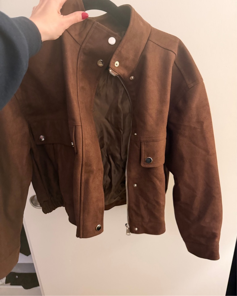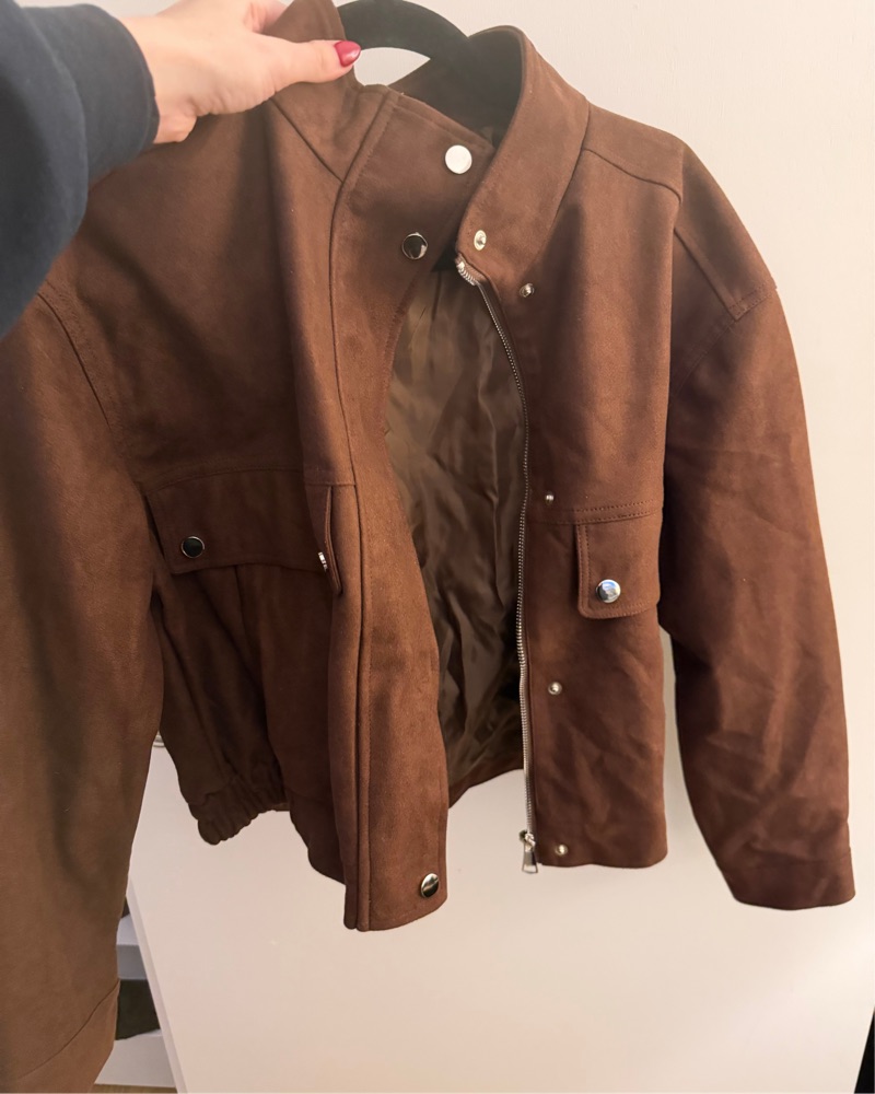 This chic suede moto jacket is the perfect addition to any cold-weather wardrobe. Pair it with your favorite jeans and boots for a stylish, casual look.