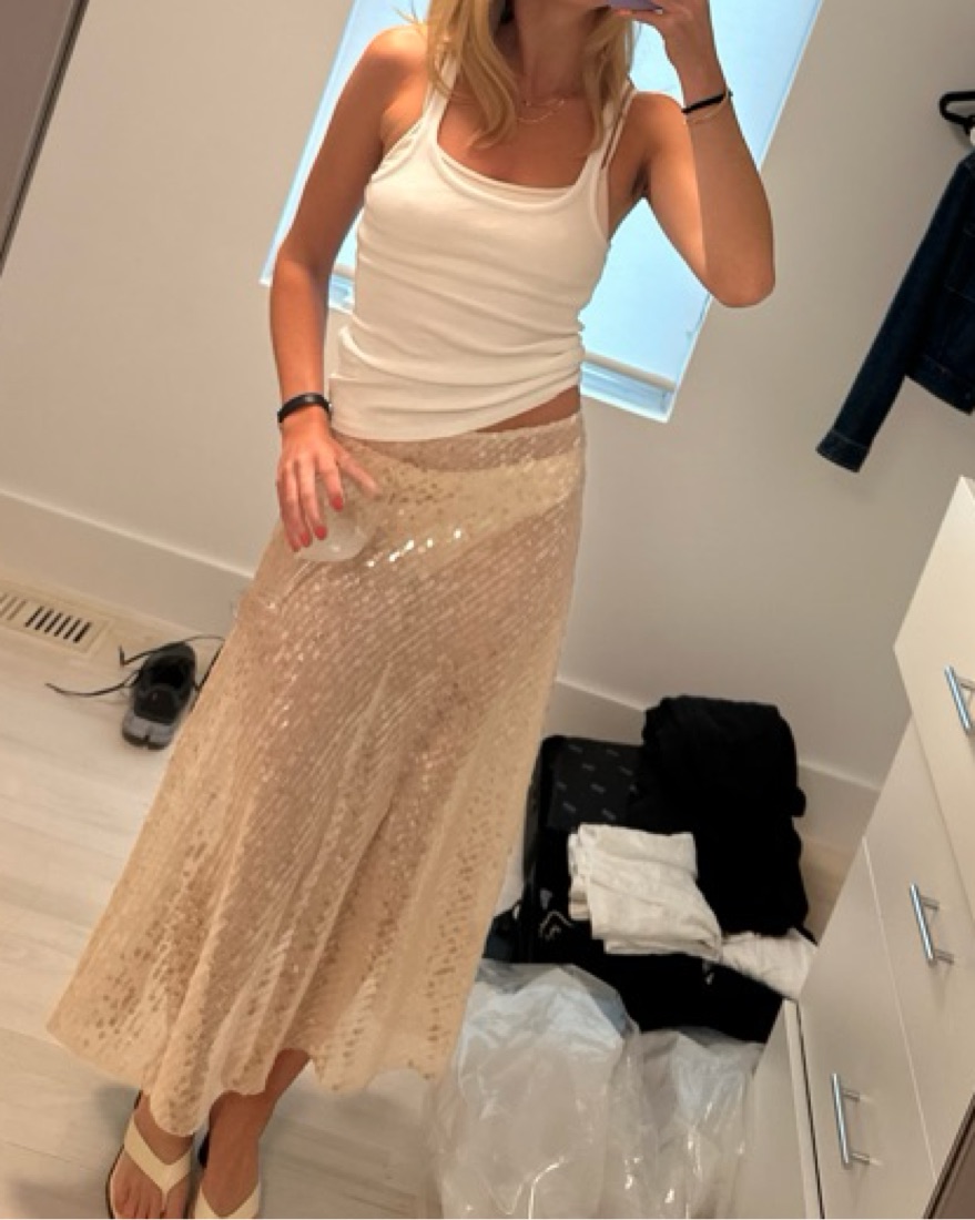 High waisted sheer midi skirt with sequins and raw hem. Perfect for a beach club!