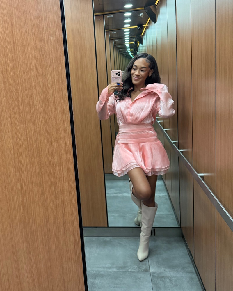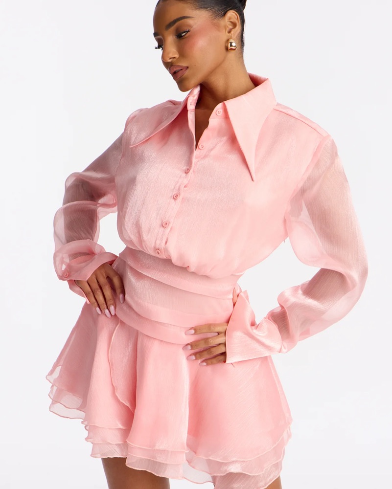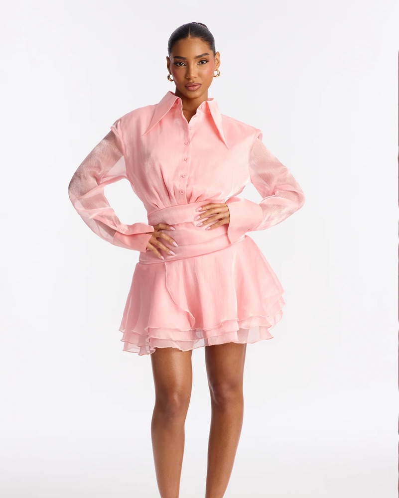 This charming pink mini dress features delicate ruffles and a flattering silhouette, perfect for a or special occasion or brunch!