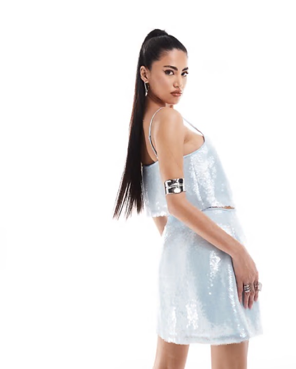 Icy blue akirt and camisole matching set. Covered in blue sequins, skirt is fully lined.