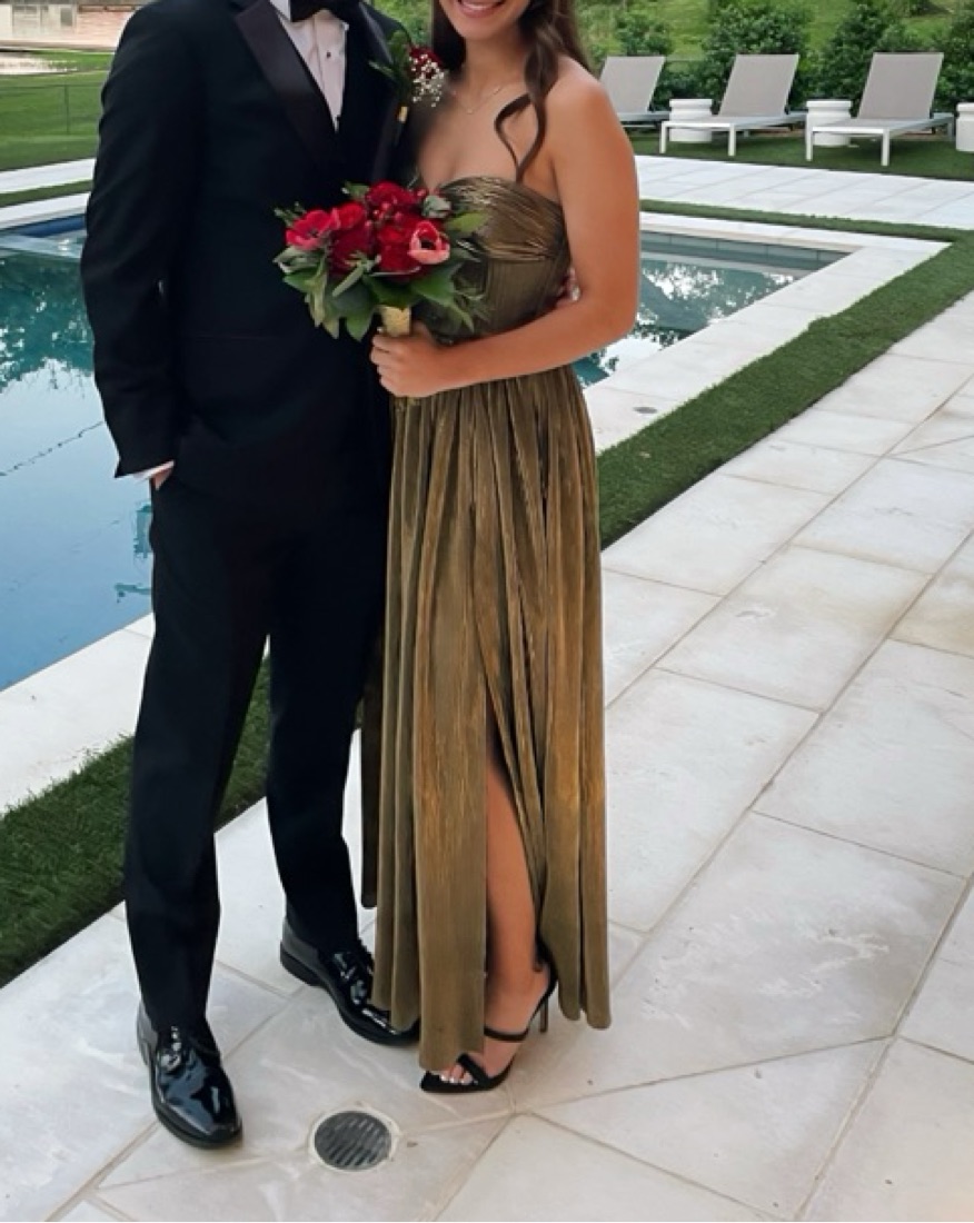 This gold metallic gown is perfect for a formal event or black-tie affair. Was a size medium but got it altered to fit me, i’m a size small. Would fit a 4-6
