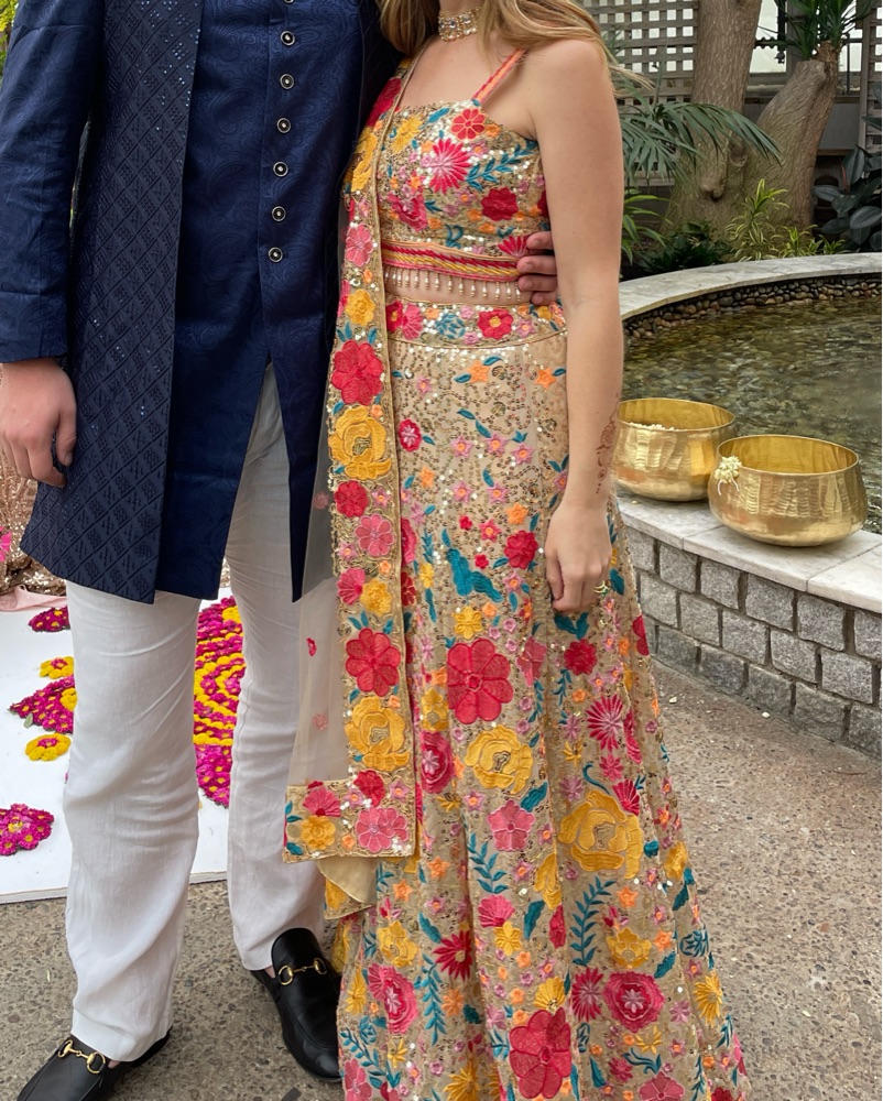 Worn once to Indian wedding and got tons of compliments! Very heavy skirt but adjustable for size (XS-M). Adjustable tie in back of top.