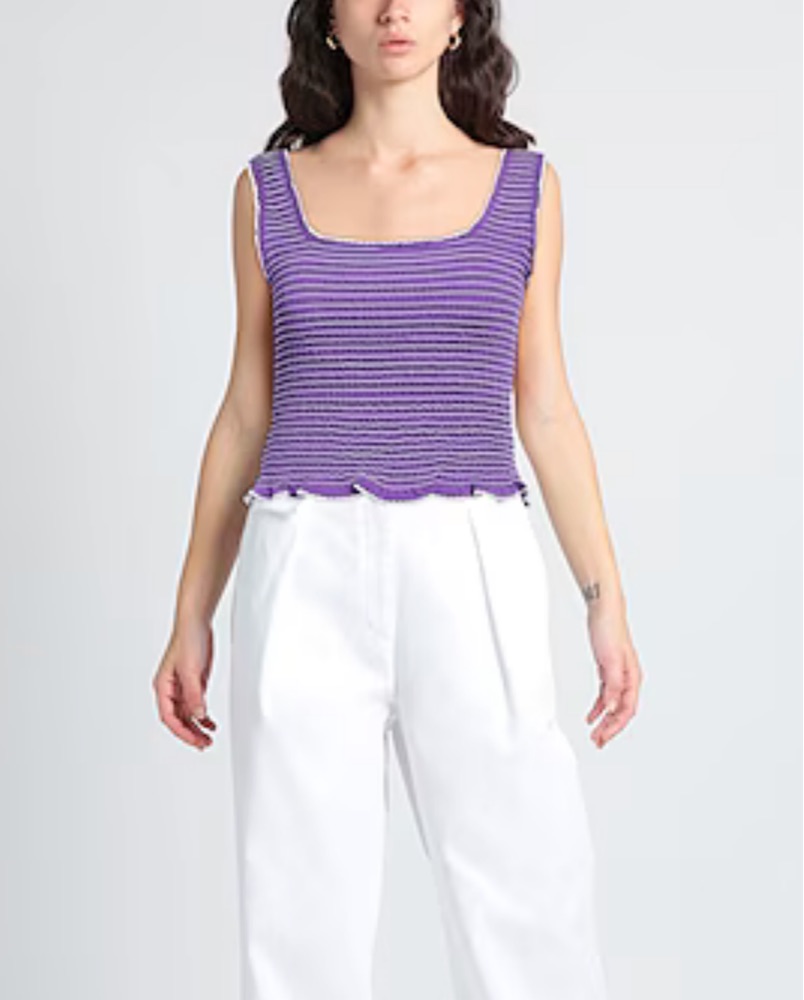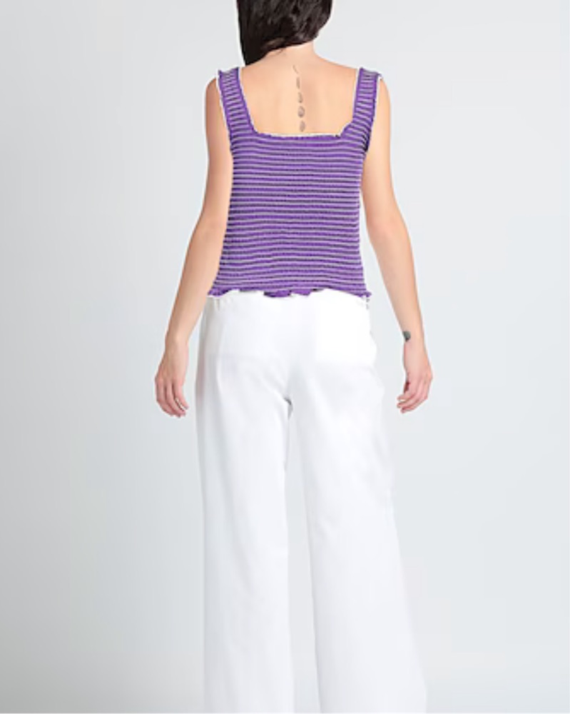 This stylish and comfortable tank top is perfect for a summer day at the beach or a casual evening out. The bold purple and white striped pattern adds a fun, eye-catching touch to any outfit.