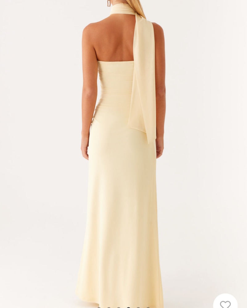 This elegant halter neck maxi dress is perfect for a formal event or special occasion. The flowing silhouette and warm yellow color creates a sophisticated and glamorous look.