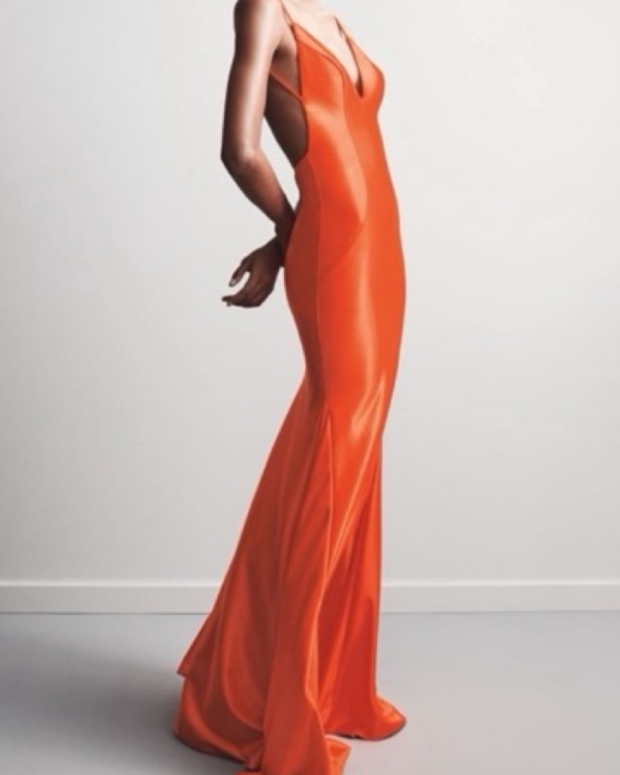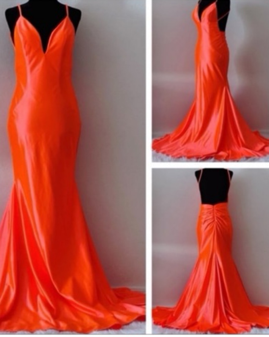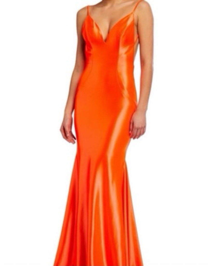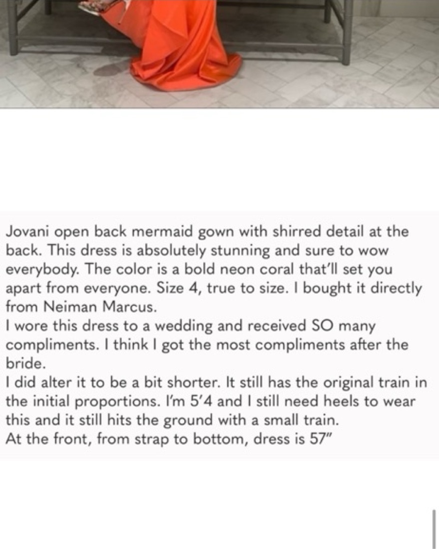 Jovani open back mermaid gown with shirred back. Stunning neon orange color. Size 4. Approx $550 original price. **Please read the description in the last photo**