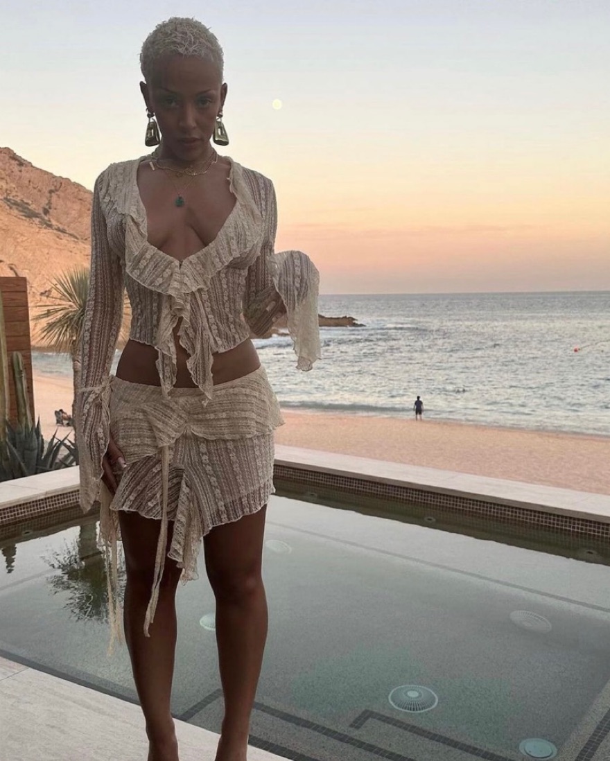Beige lace top with front hook-and-eye closure Flutter sleeves and neckline