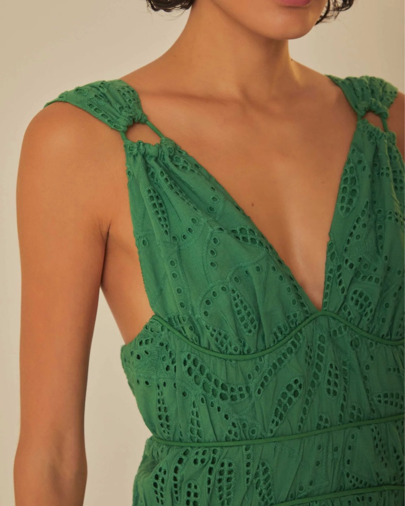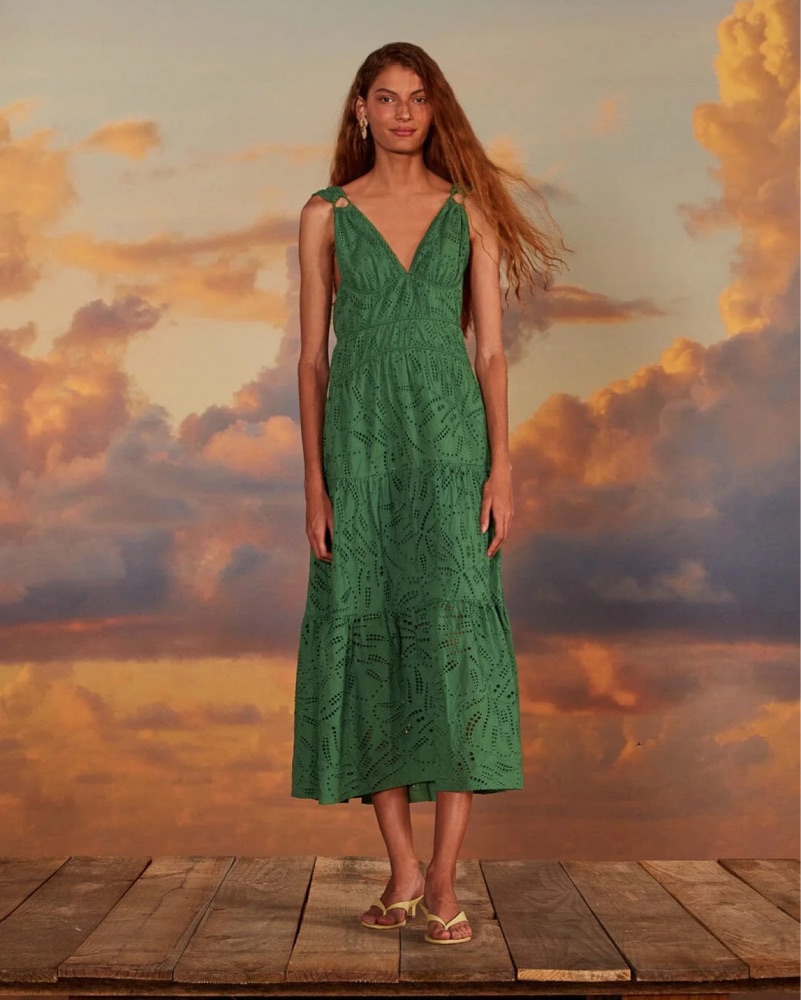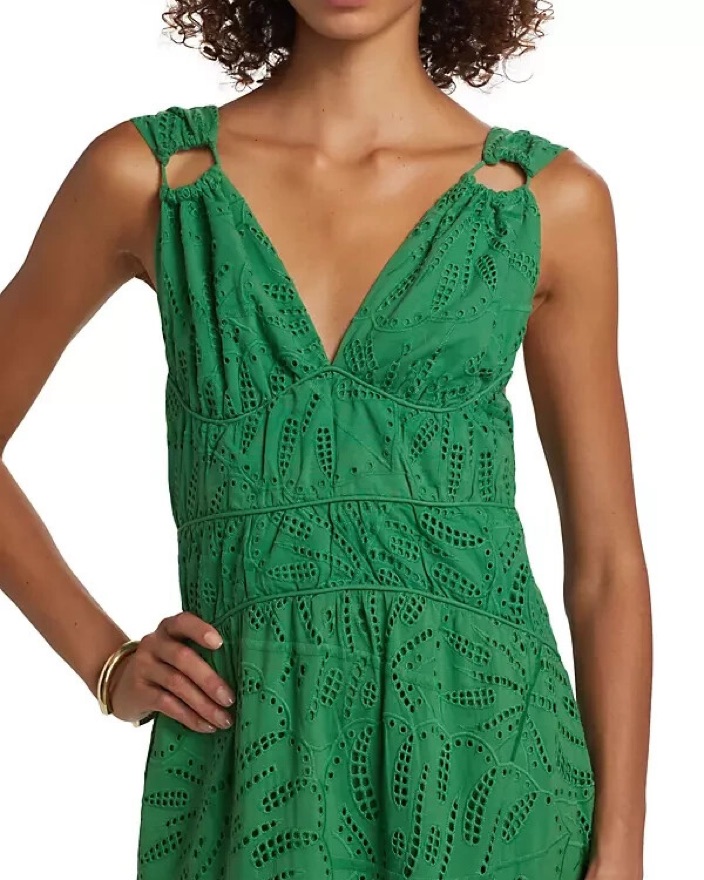 It’s giving *feminine energy*!! This dress is absolutely stunning & hugs in all of the right places while also flowing perfectly! Zippered back. Eyelet design.