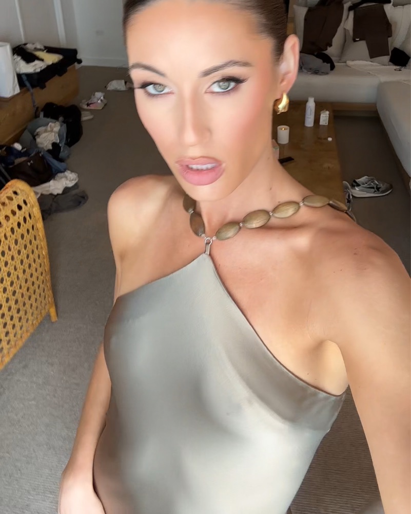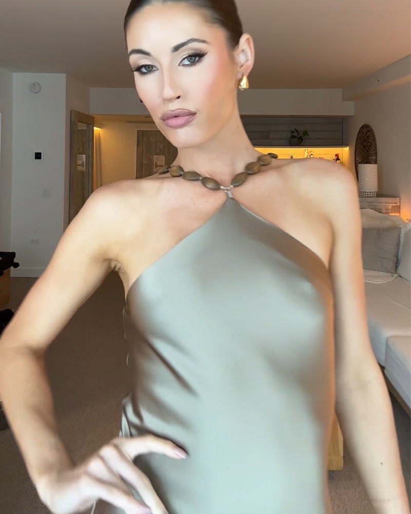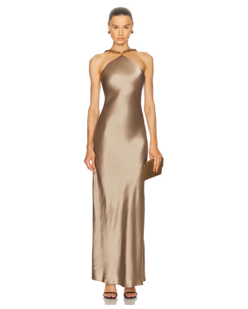 Unlined Hidden back zipper closure Wooden beaded accent at shoulder straps Adjustable shoulder straps Satin fabric with back vent