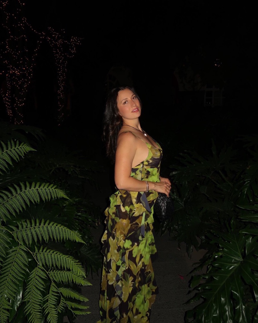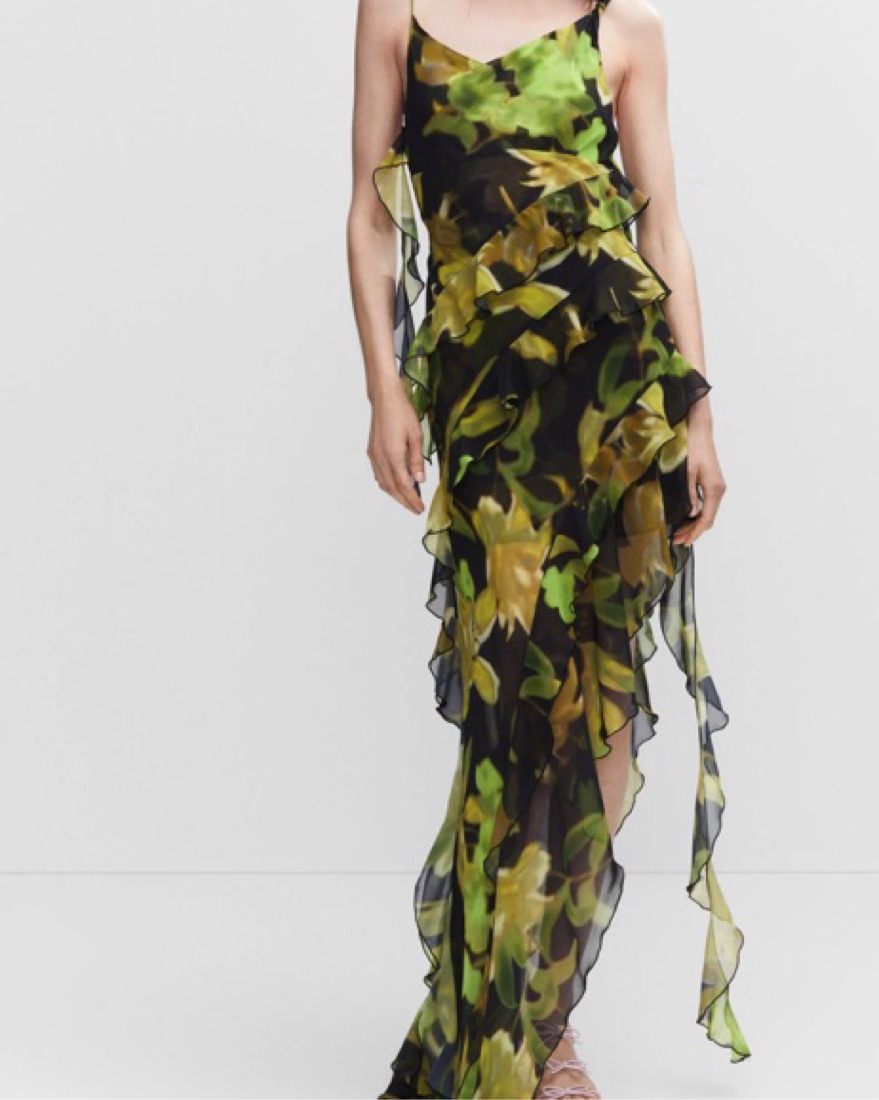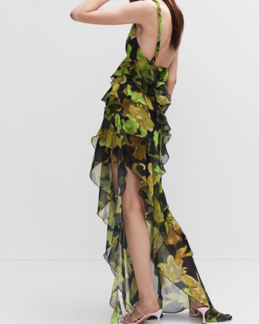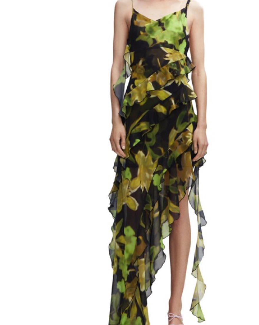 In perfect condition. Only worn once for a photo. Flowy fabric, ruffle details, draped neck. Perfect for sizes 4-8