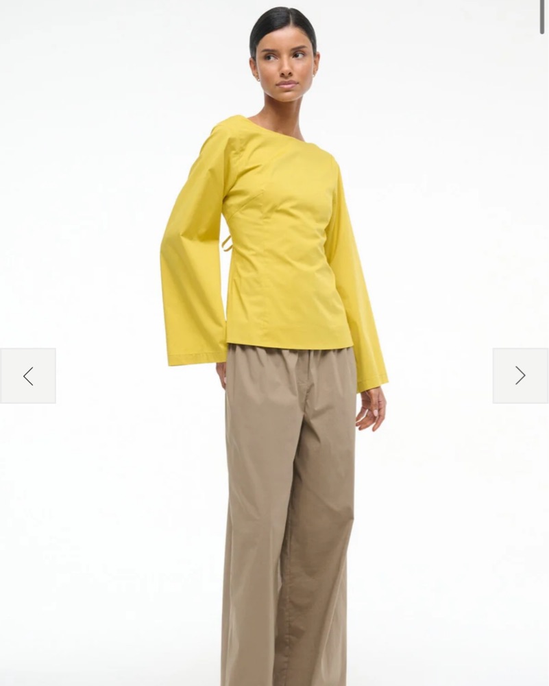 Staud long sleeve top with open back. The coolest color and style, super flattering with the tie in the back. Looks great with jeans or a fun pair of leather pants. Fits small or medium!