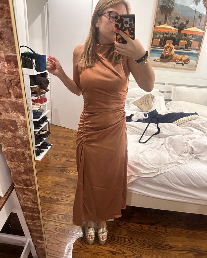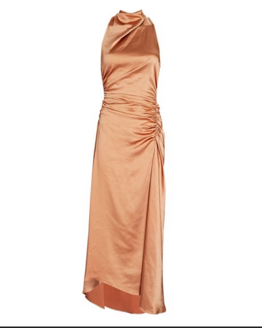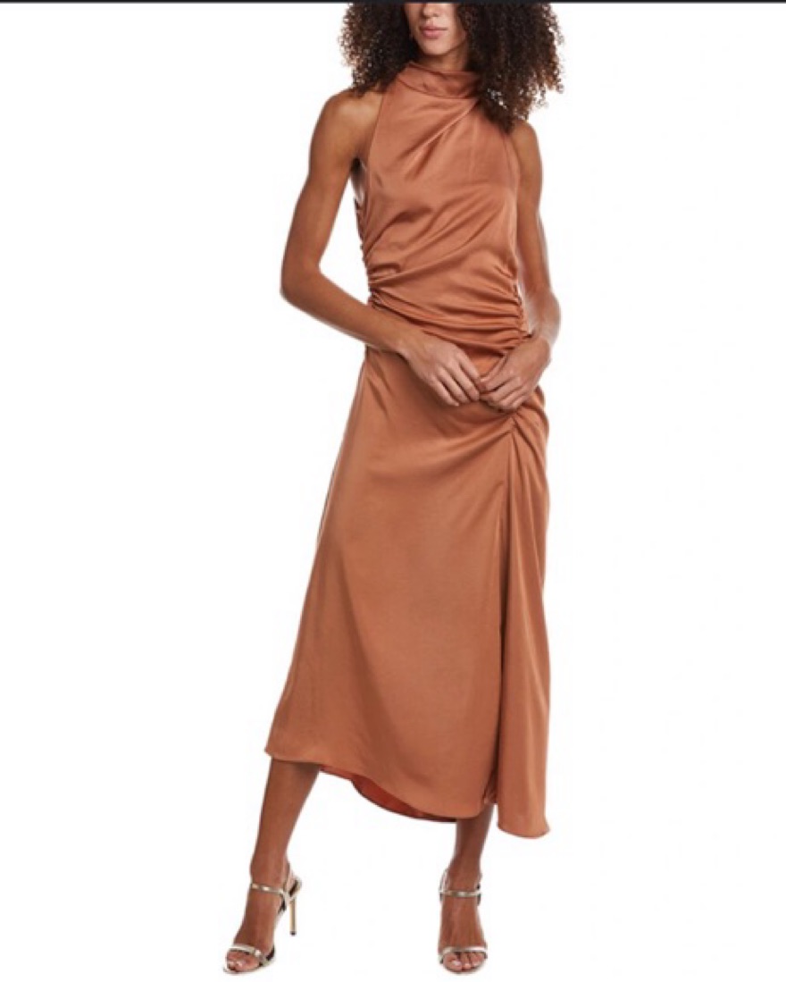 ALC Ruched Satin Midi Dress in Copper