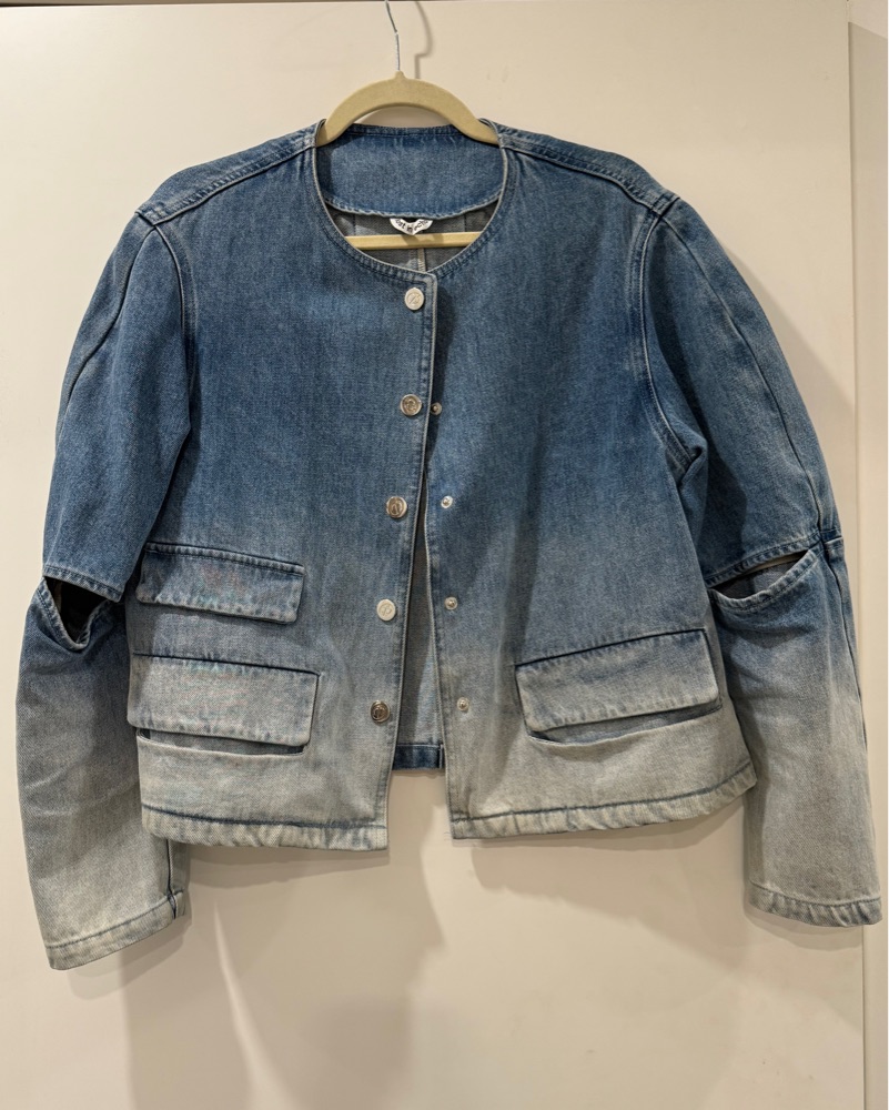 Lost In Echo ombre denim jacket with arm slits! Love the asymmetrical pocket detailing and the little belt buckle on the back!