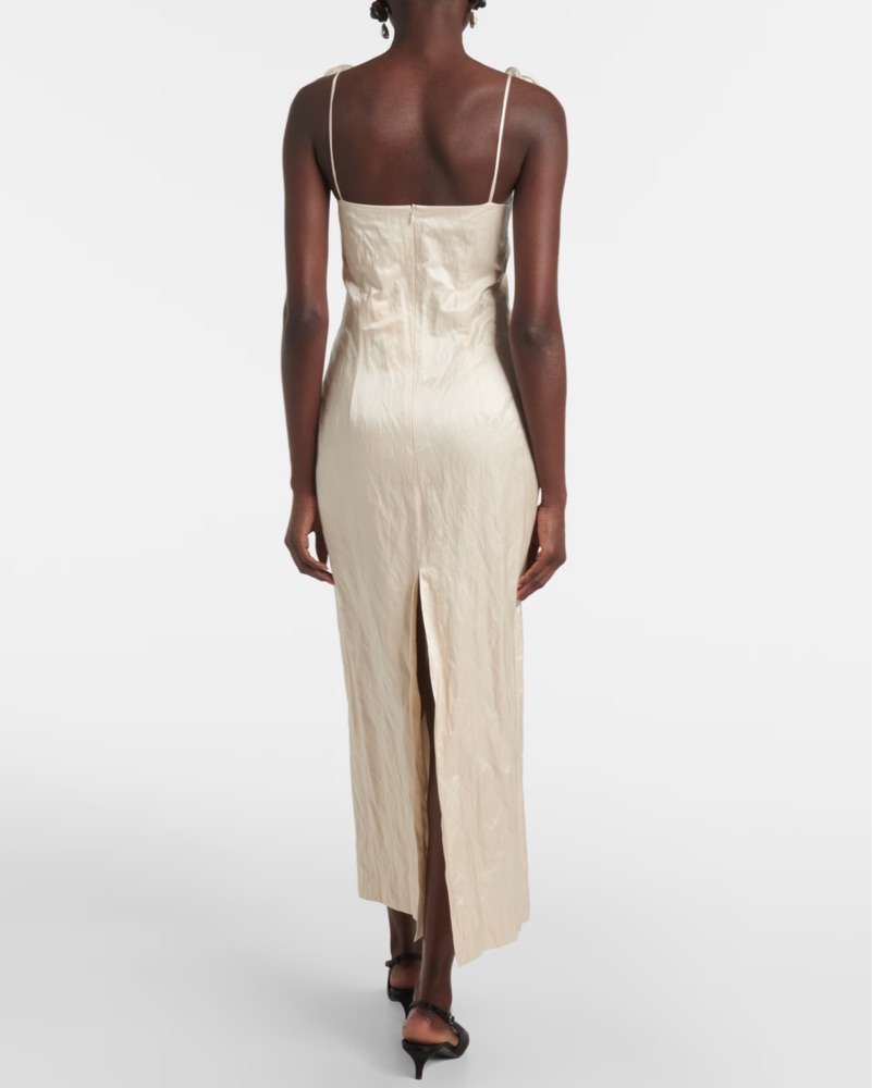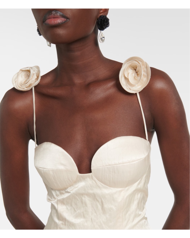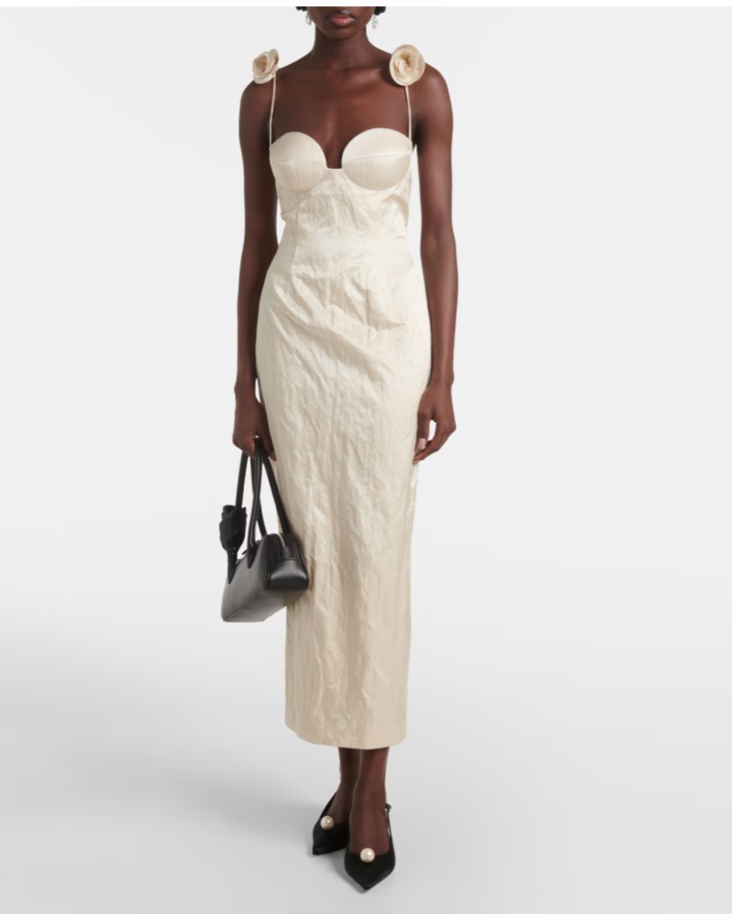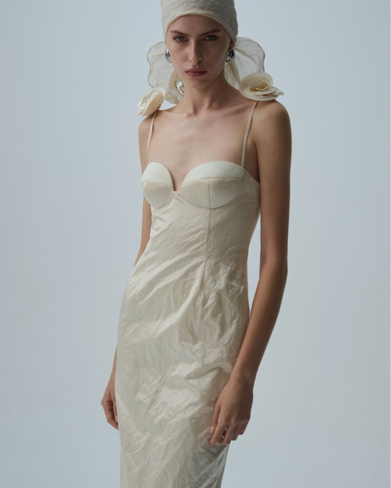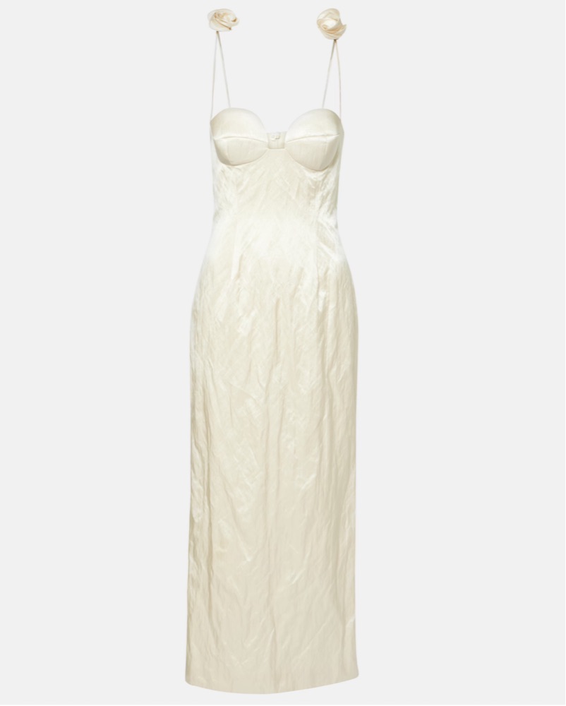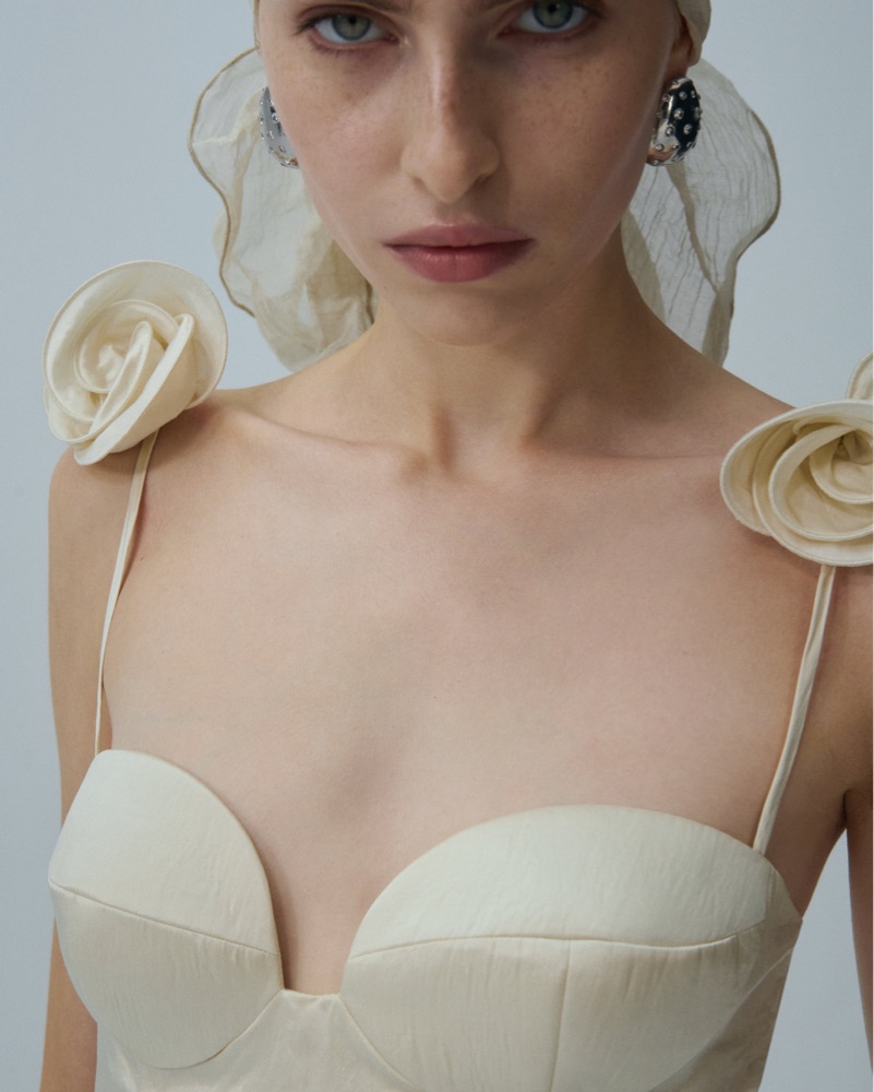 An iconic bustier midi dress shape from Magda Butrym in a new Japanese cotton crinkle fabric, complete with 3D rosettes at the shoulder straps.