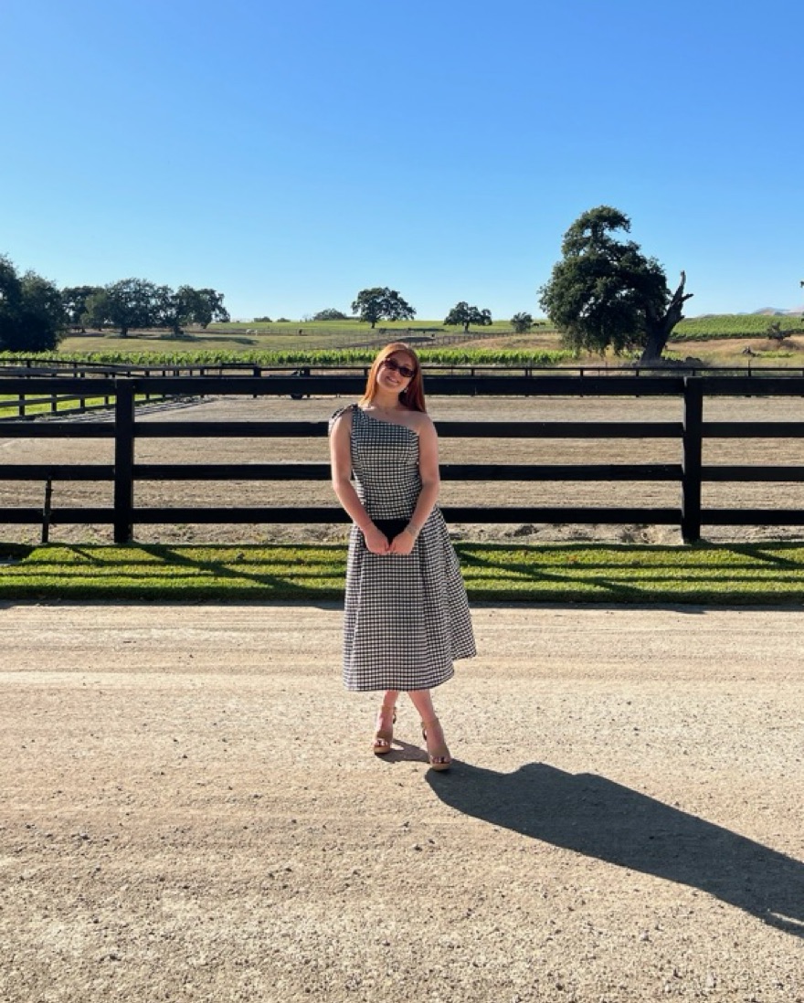 This one shoulder gingham midi dress. Drop waist, side zipper. In pic I wore to wedding