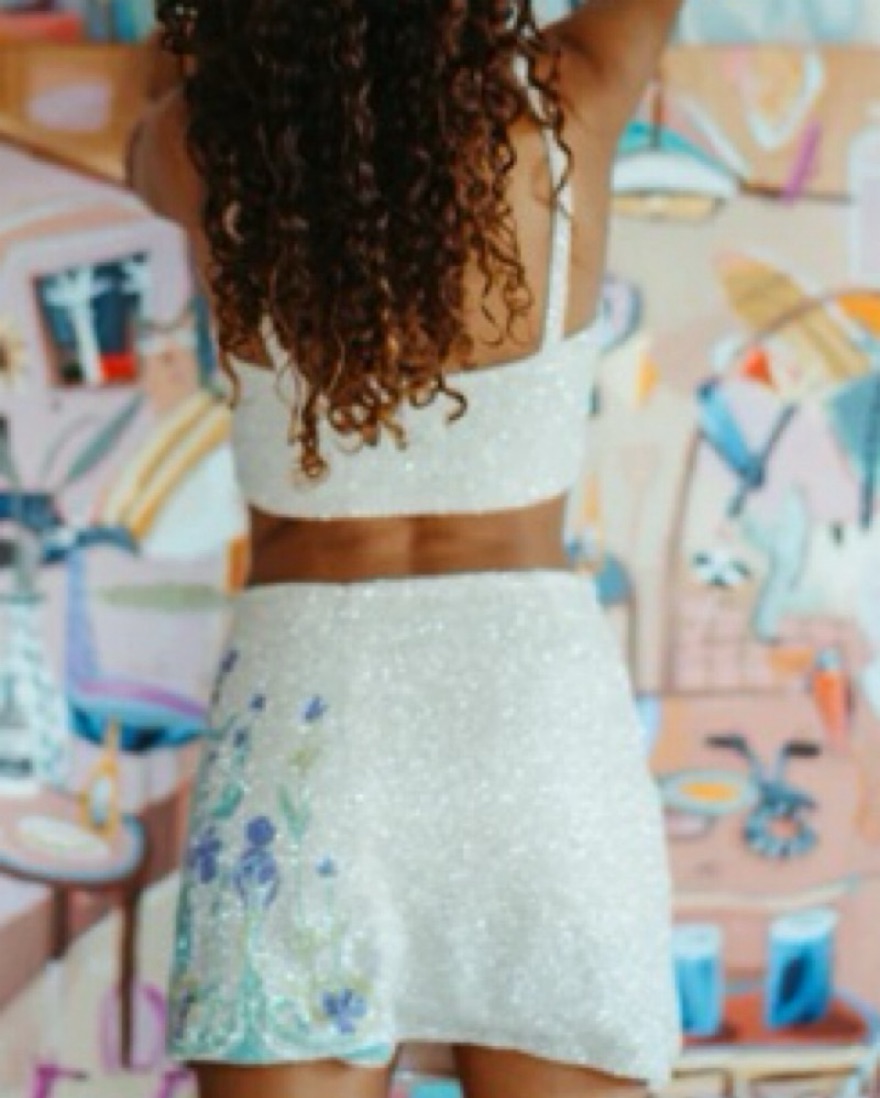 This stunning two-piece set is perfect for a night out, birthday or festival. The glittering top and patterned skirt create a fun, feminine look. Note the background beading is more light pink vs yellow. See last photo.