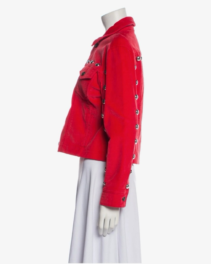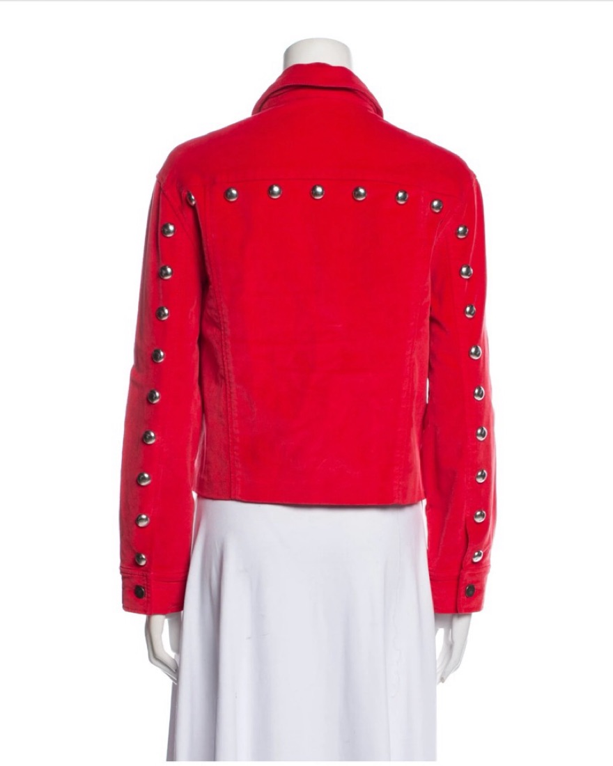This bold, eye-catching red denim jacket features a chic studded design, perfect for adding a touch of edgy style to any outfit.