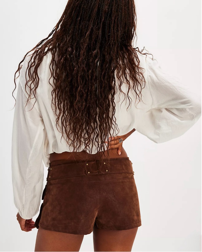Fit: Low-rise, micro silhouette with shorts underneath Features: Sleek vegan suede fabrication, oversized flap pockets at the side, studded hardware embellishments, belted waistband feature