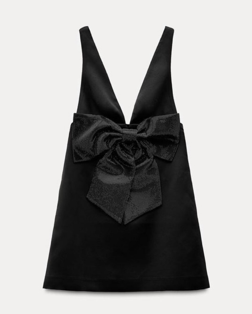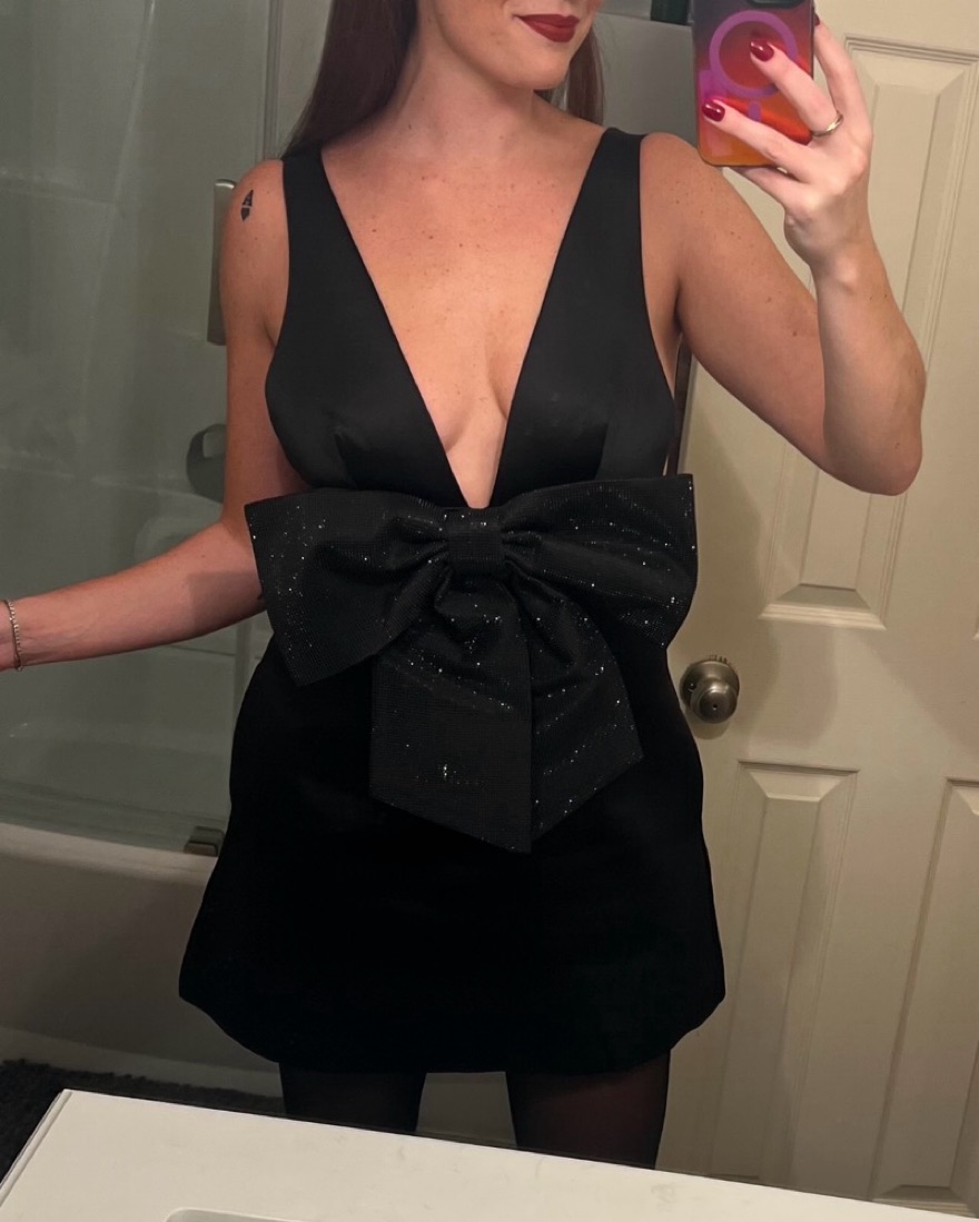 This stunning black rhinestone bow mini dress is perfect for a night out on the town, holiday party, or formal event. The eye-catching rhinestones, plunging neck and flattering a-line silhouette will have you feeling confident and fabulous. **only worn once!**