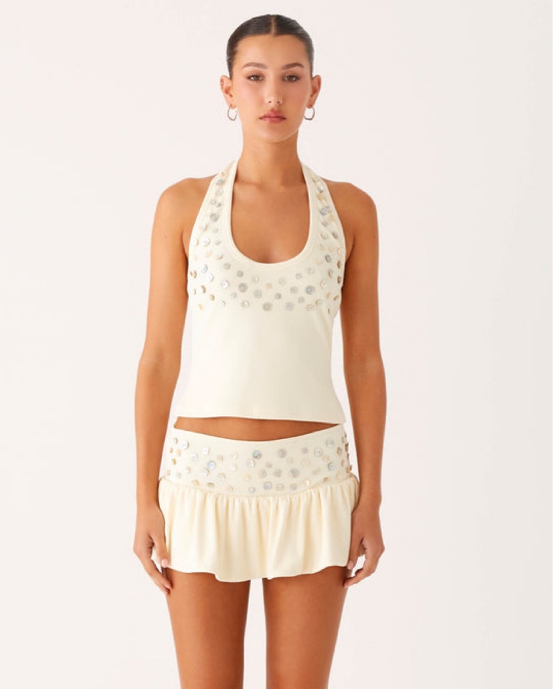This chic cream halter top and mini skirt set is perfect for a night out. The sparkling embellishments add a touch of glamour to this stylish look.