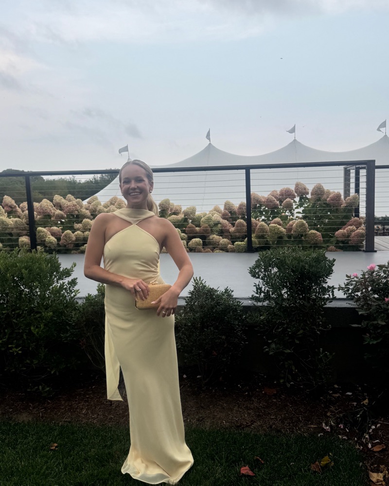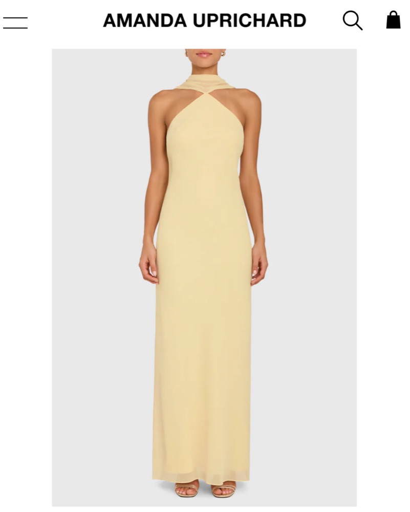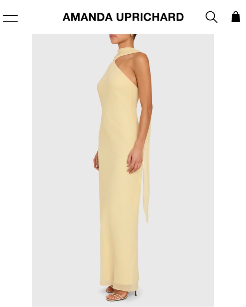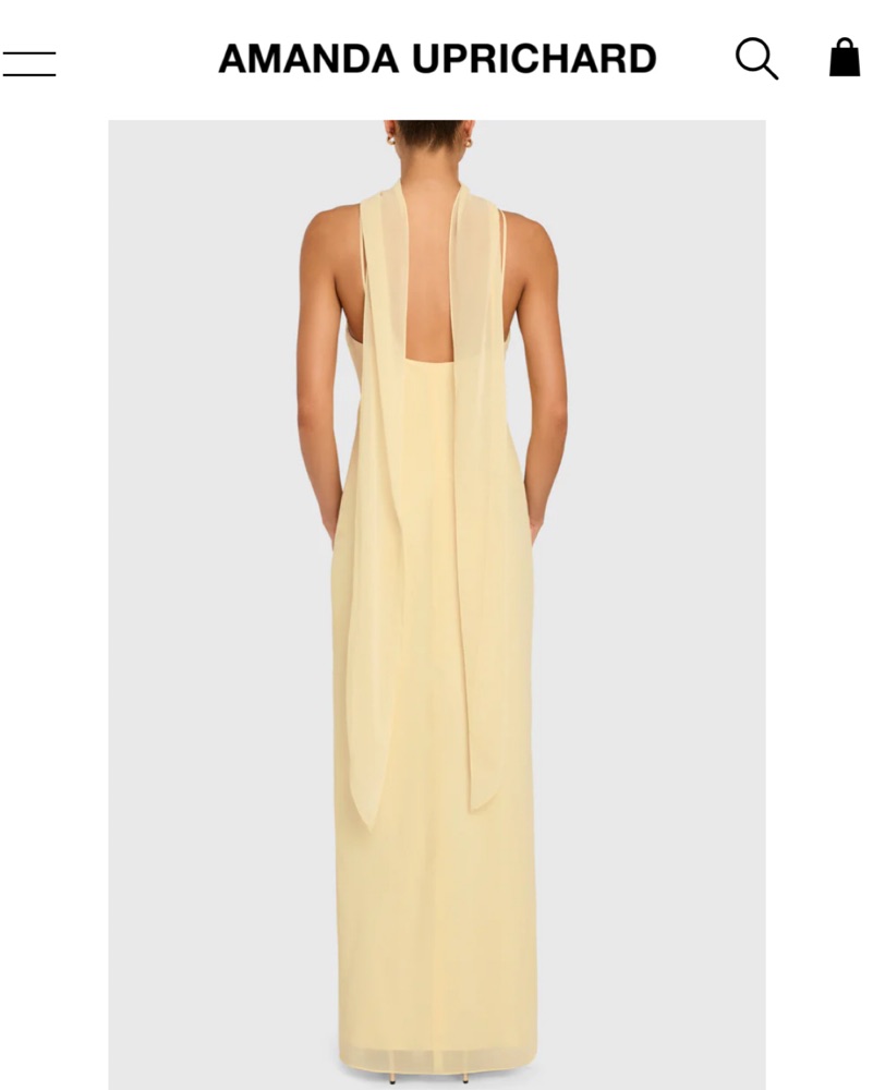 Amanda uprichard dress, a butter yellow, so cute. A little long on me in high heels and I’m 5’ 3”. Neck sash is attached