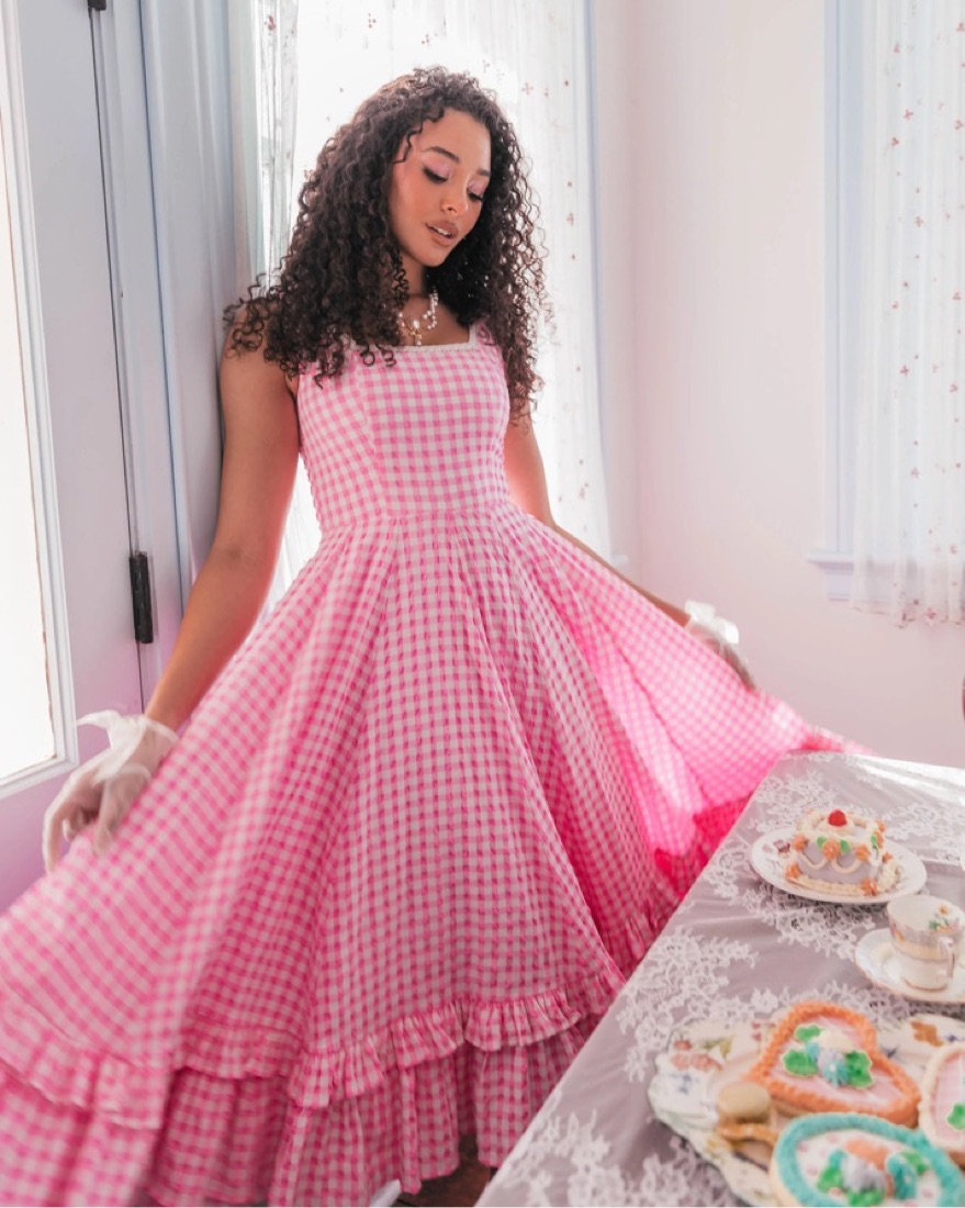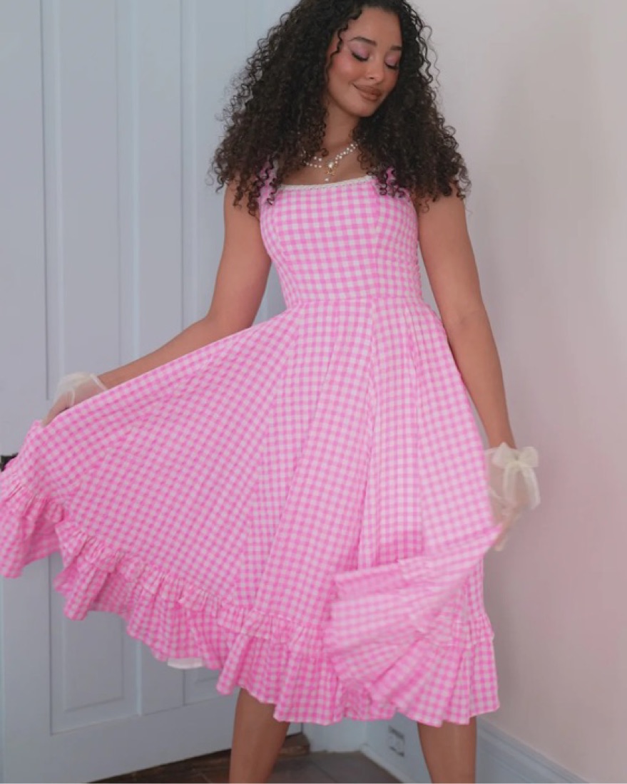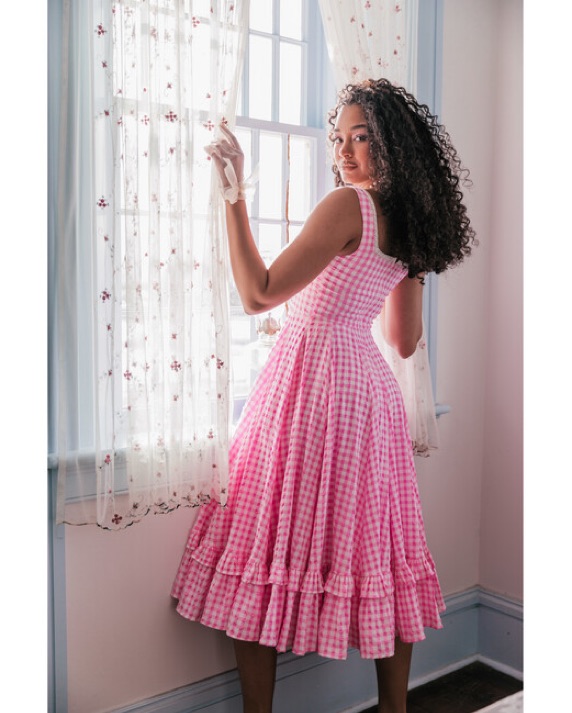 This charming gingham midi dress exudes effortless elegance, perfect for a garden party or afternoon tea.